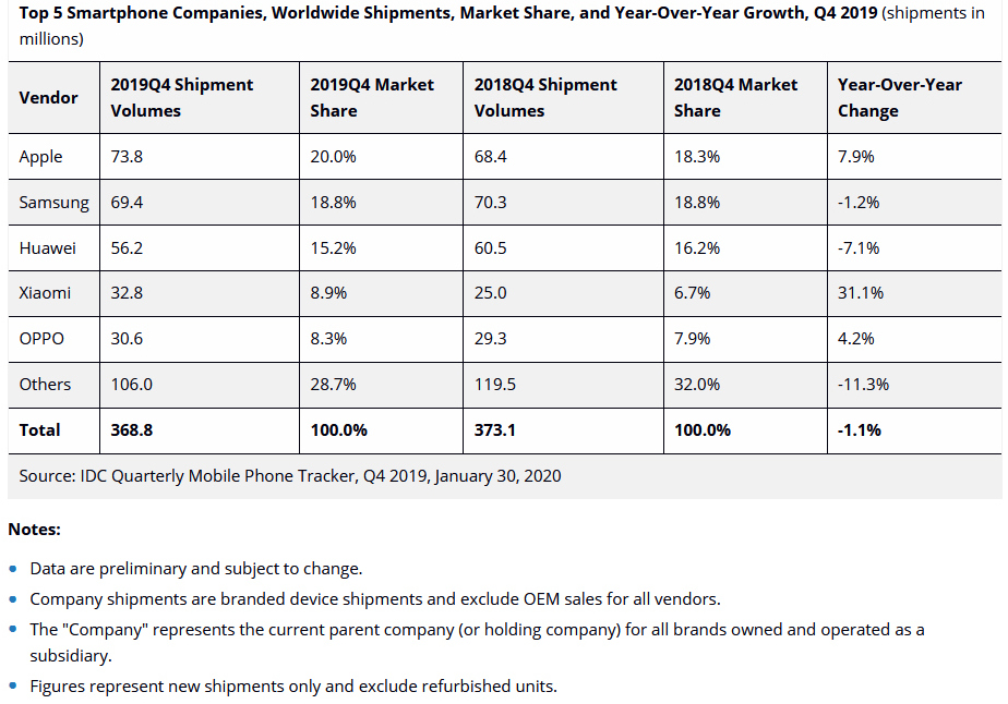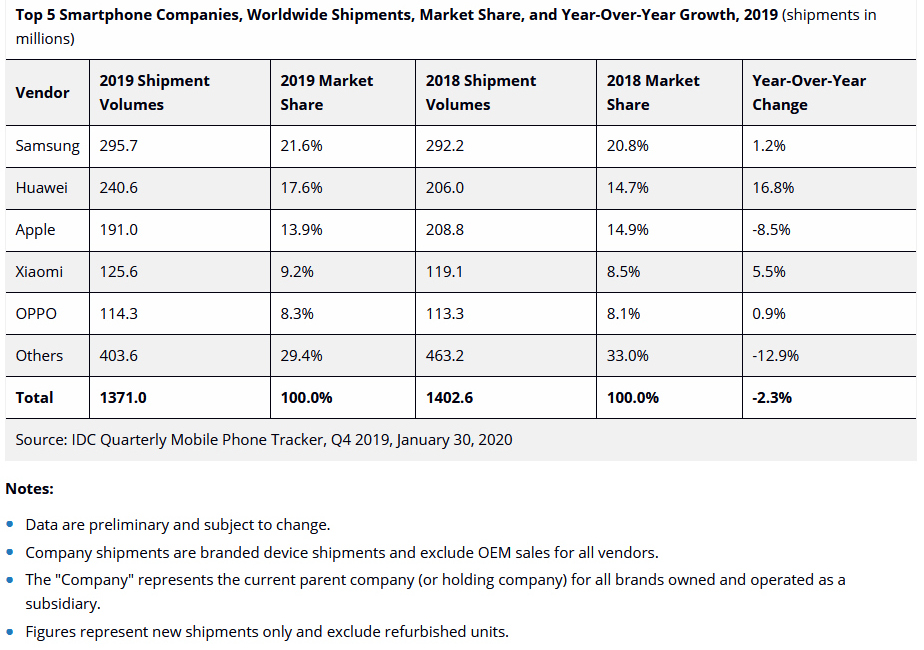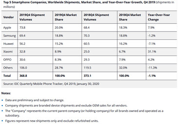 Sehr gut lief es im Schlussquartal 2019 für den chinesischen Smartphone-Hersteller Xiaomi. Der größte Markt für Xiaomi war auch in Q4/2019 wieder Indien. Dort waren vor allem die Handyserien Xiaomi Redmi 8 und Redmi Note 8 die Verkaufsschlager. Im 4. Quartal 2019 legte Xiaomi um 31,1 % auf 32,8 Mio. Smartphones zu. Auch Oppo expandierte weiter außerhalb Chinas und setzte 30,6 Mio. Handys (+4,2 %) ab.