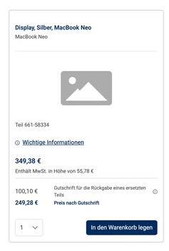 Apple gewährt einen Rabatt, wenn die defekte Komponente, die durch das Ersatzteil getauscht wurde, zurückgeschickt wird – diese Maßnahme soll die Umwelt schonen, da Apple so sicherstellen kann, dass die Komponenten fachgerecht recycelt oder entsorgt werden. Für Kunden ist die Rücksendung nicht zuletzt aus finanziellen Gründen empfehlenswert, da sich so beispielsweise der Preis des Displays des MacBook Neo von 349 Euro auf 249 Euro reduziert.