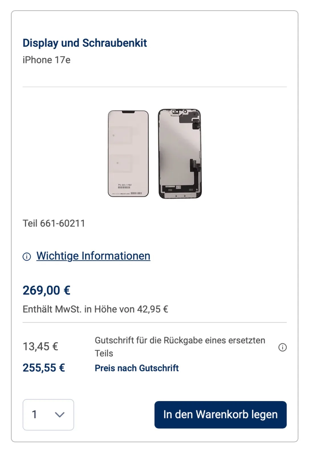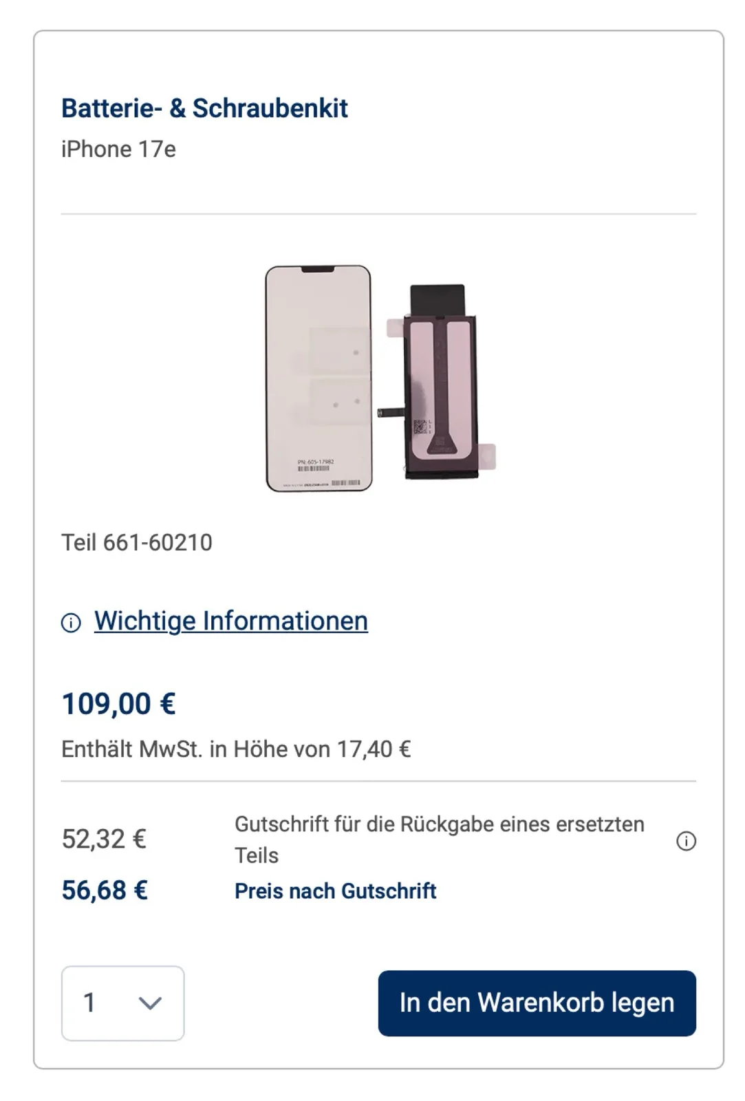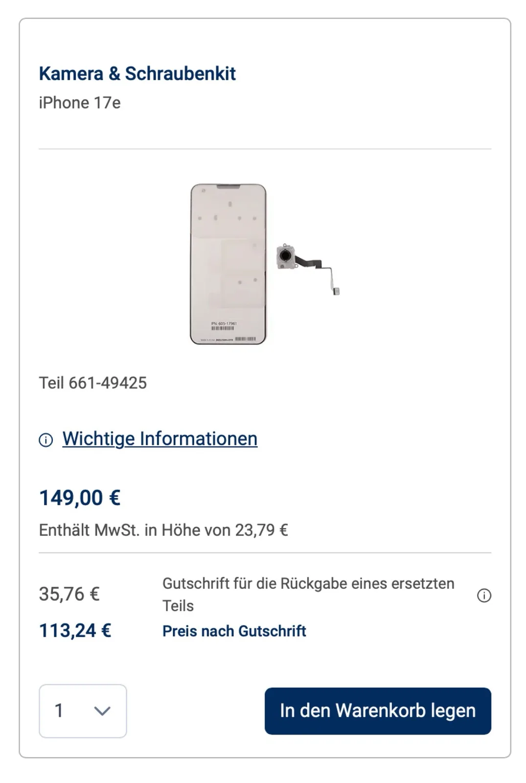Wer den Standfuß oder das Gehäuse des Studio Display XDR ersetzen möchte, muss dafür jeweils 519 Euro bezahlen, für jeden der beiden Lüfter veranschlagt Apple 59 Euro. Den Preis des Displays selbst gibt der Store nicht an. Beim iPhone 17e gestaltet sich der Akku-Tausch mit einem Preis von effektiv rund 56 Euro immerhin relativ günstig, ein neues Display schlägt aber mit 255 Euro zu Buche, eine neue 48 Megapixel Kamera kostet 113 Euro.