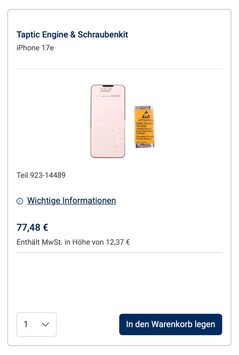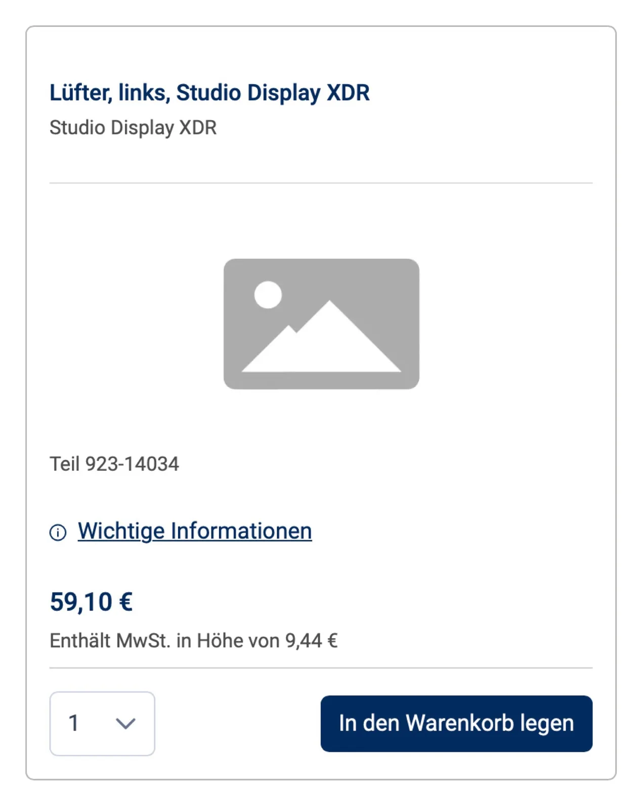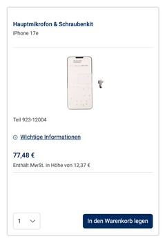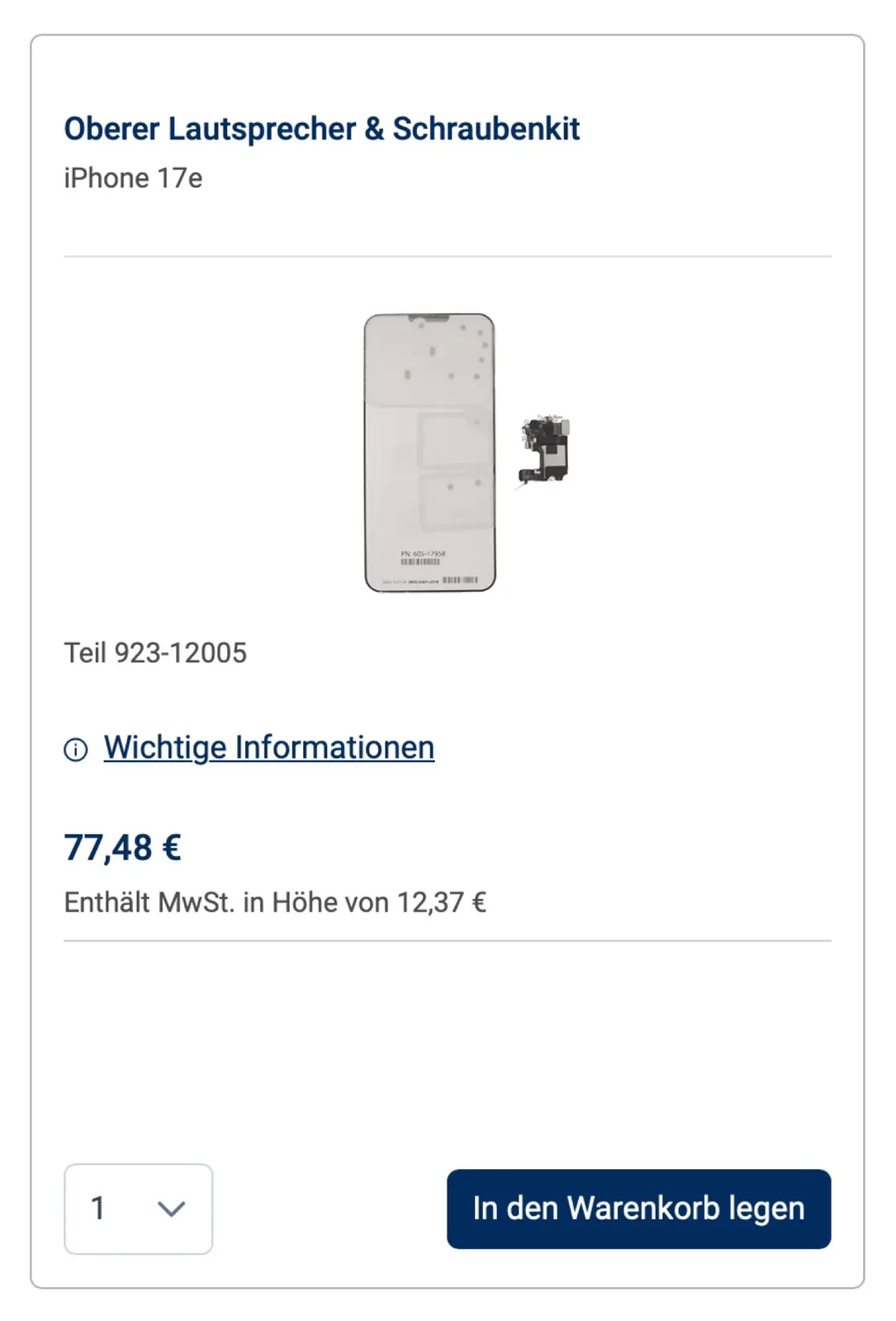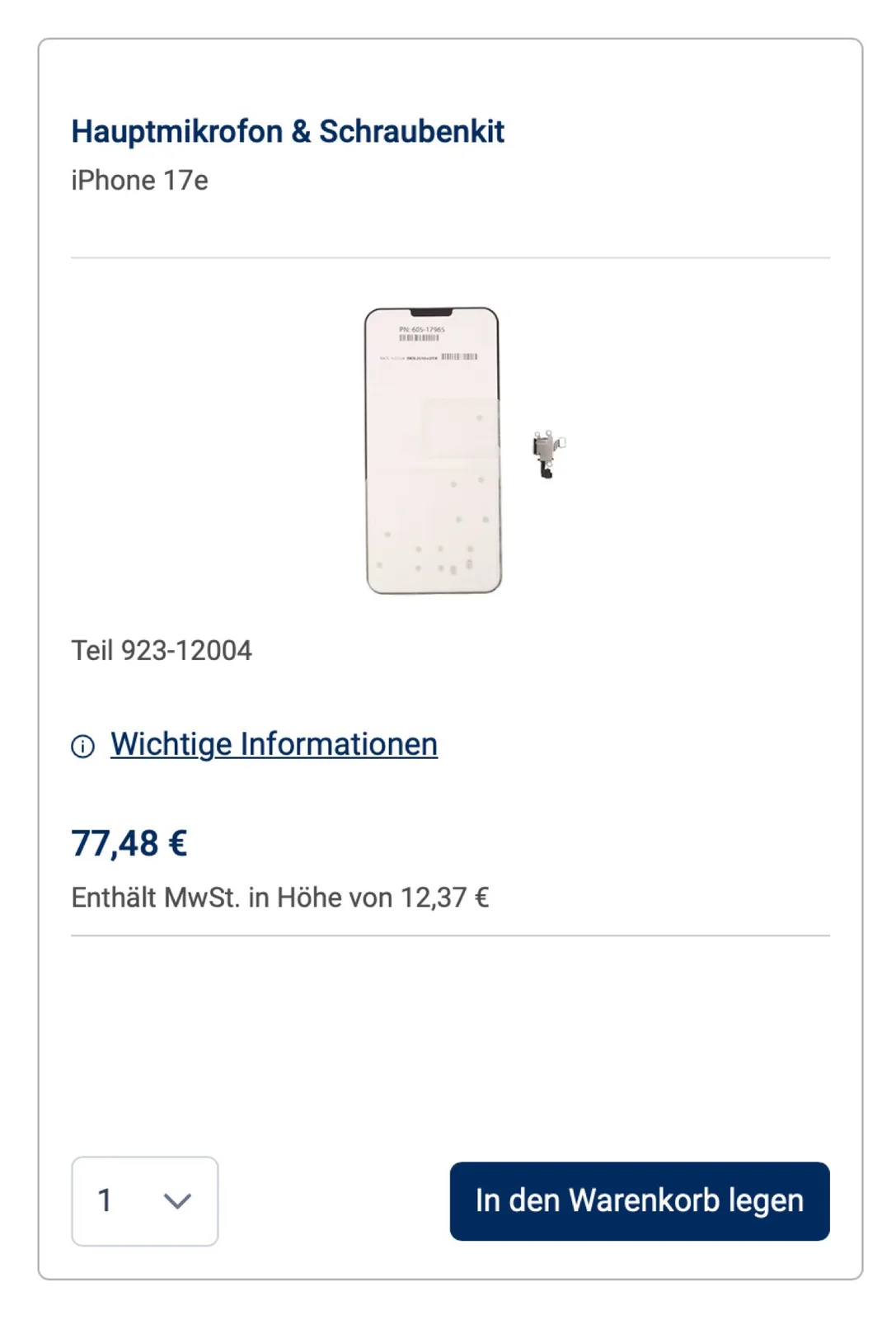 Wer den Standfuß oder das Gehäuse des Studio Display XDR ersetzen möchte, muss dafür jeweils 519 Euro bezahlen, für jeden der beiden Lüfter veranschlagt Apple 59 Euro. Den Preis des Displays selbst gibt der Store nicht an. Beim iPhone 17e gestaltet sich der Akku-Tausch mit einem Preis von effektiv rund 56 Euro immerhin relativ günstig, ein neues Display schlägt aber mit 255 Euro zu Buche, eine neue 48 Megapixel Kamera kostet 113 Euro.
