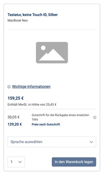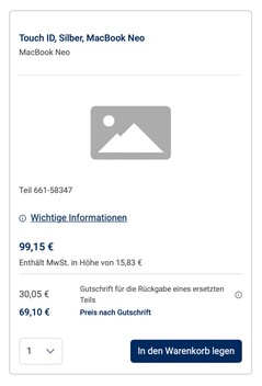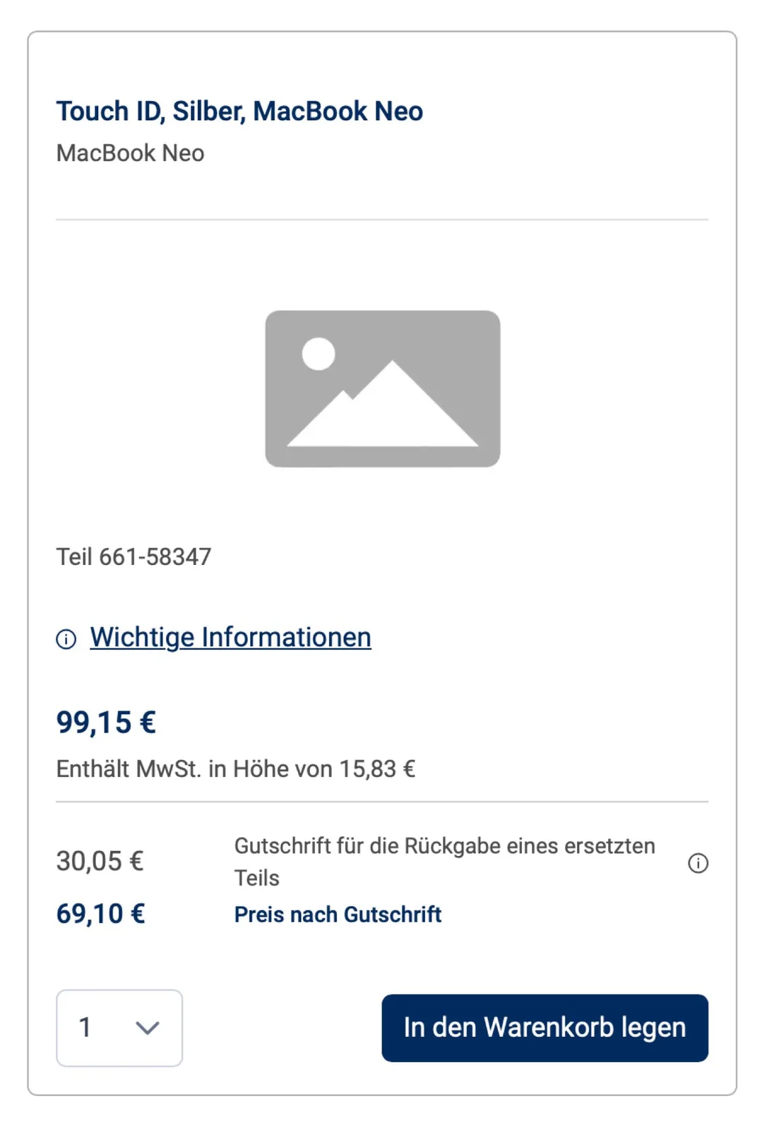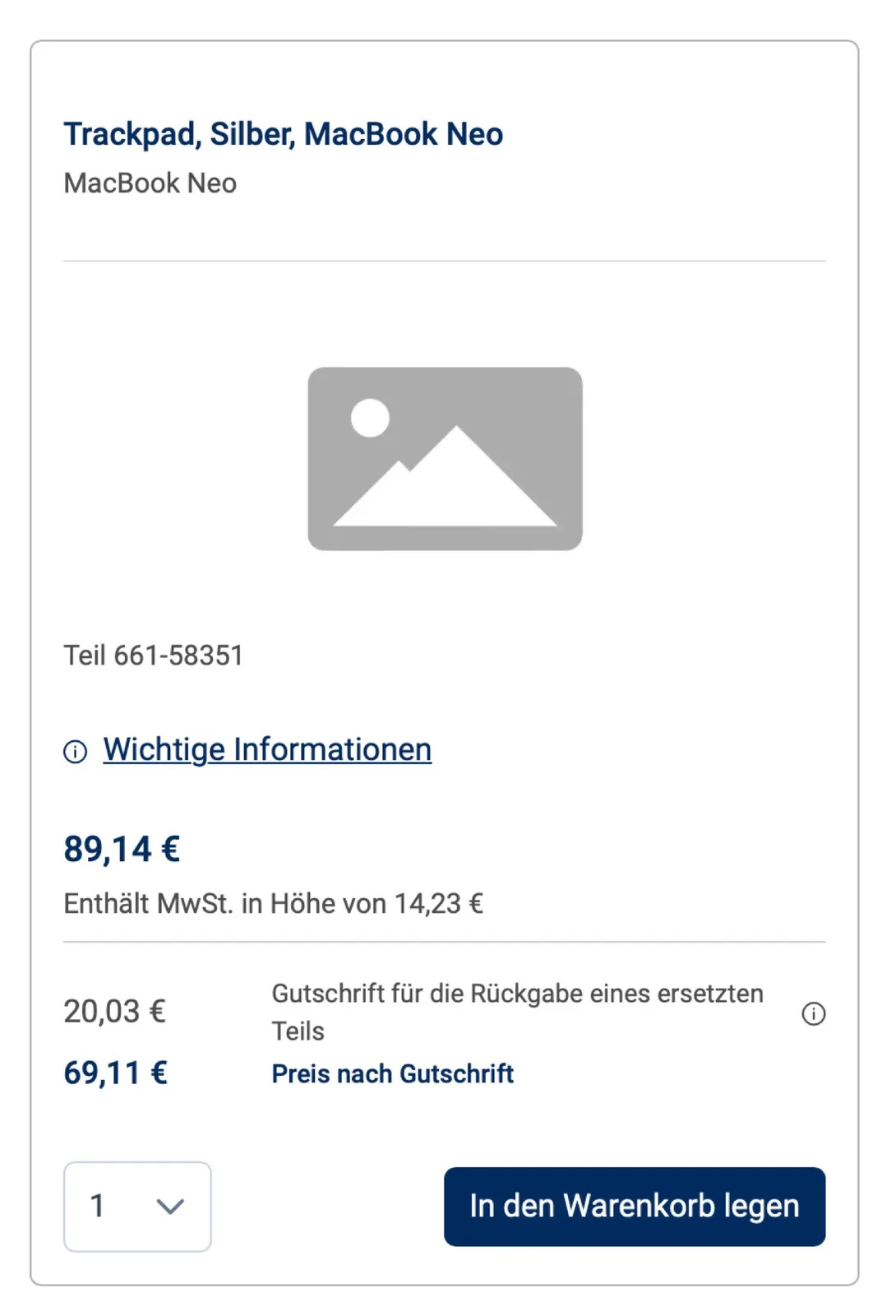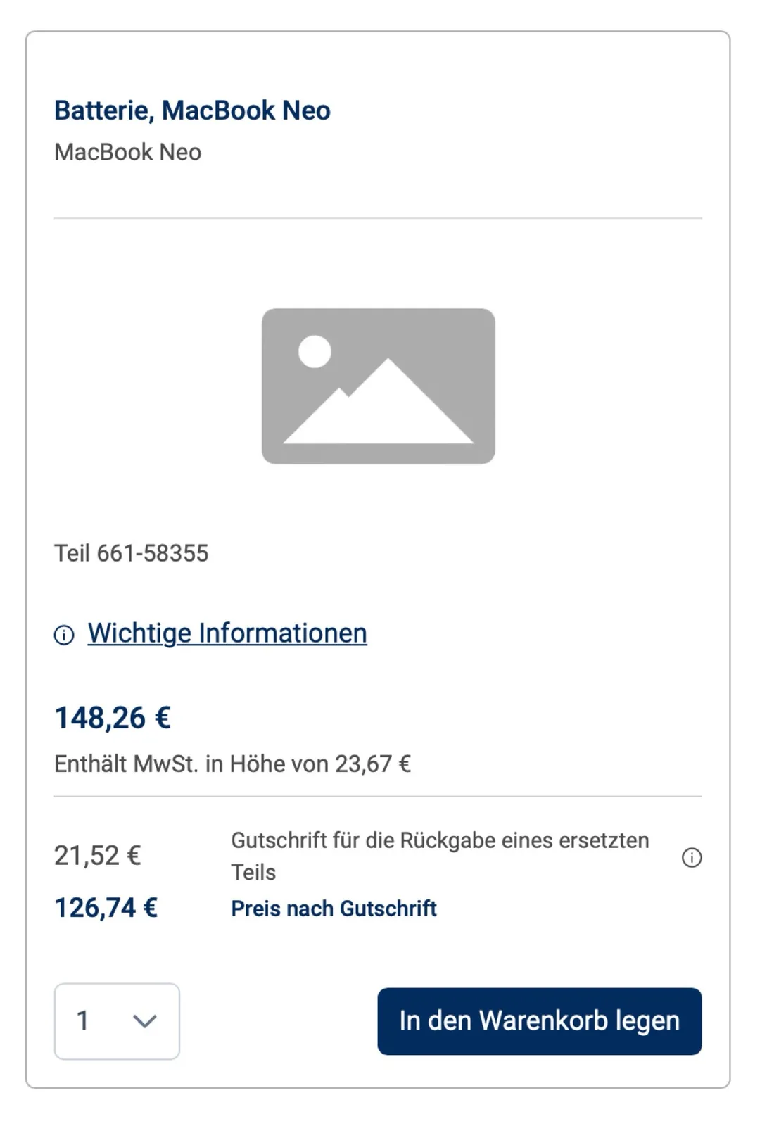 Nach Rücksendung der defekten Komponenten kostet ein neuer Akku für das MacBook Neo 126 Euro, eine neue Tastatur wird für 129 Euro angeboten, ein Trackpad und ein Touch ID Fingerabdrucksensor für jeweils 69 Euro. Zum Vergleich: Ein Akku-Tausch im Apple Store kostet 169 Euro, wer die Reparatur selbst vornimmt, spart in diesem Fall also immerhin 43 Euro.