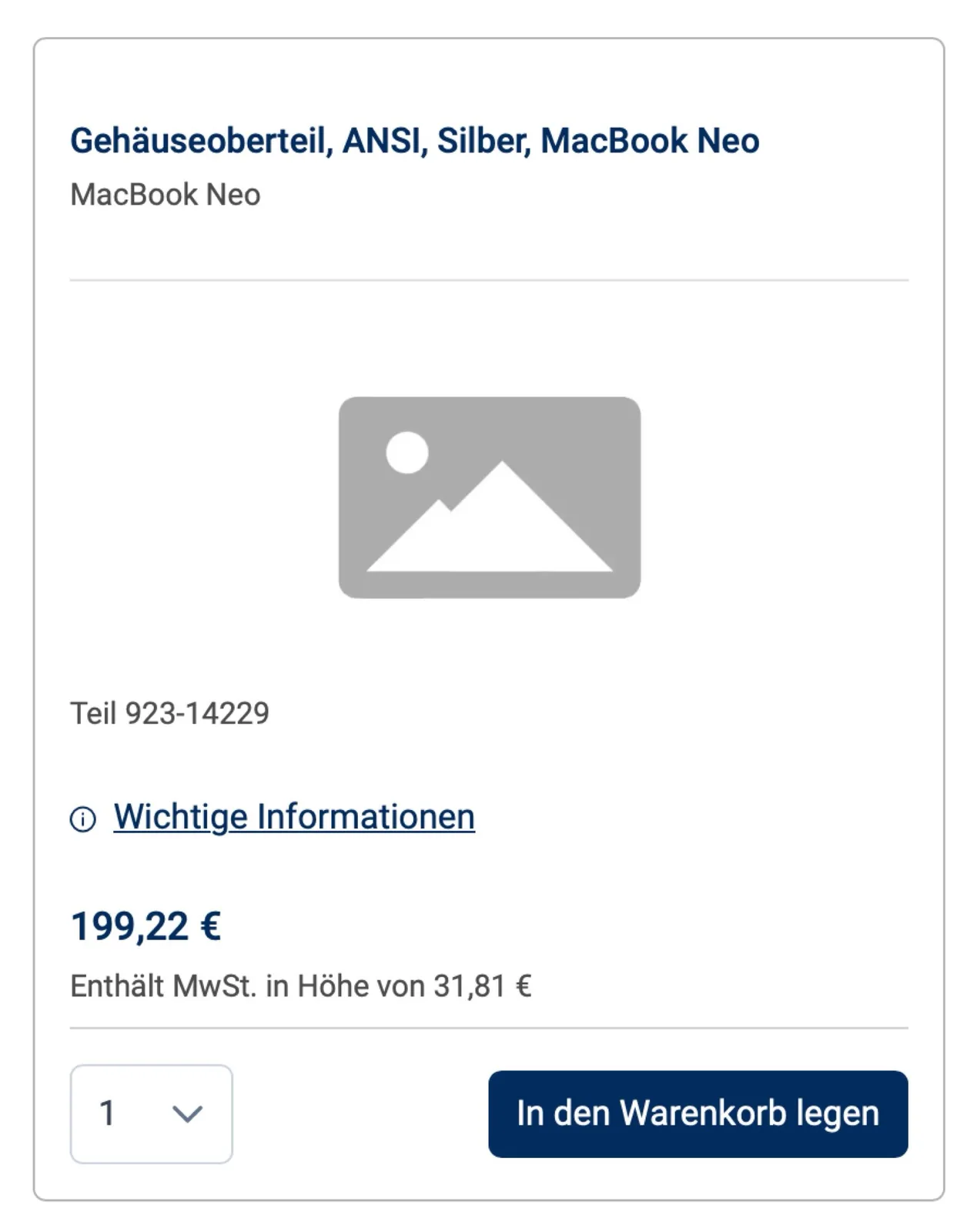 Das Sortiment des Apple Self-Service Repair Store wurde erweitert, sodass Apples offizieller Ersatzteil-Onlineshop nun auch Reparatur-Handbücher, Werkzeuge und Ersatzteile für das MacBook Neo (ca. 640 Euro auf Amazon), das iPhone 17e und das Studio Display XDR anbietet. Wie üblich können ausgewählte Komponenten, wie etwa das Mainboard, nur bestellt werden, wenn die Seriennummer des eigenen Geräts angegeben wird.