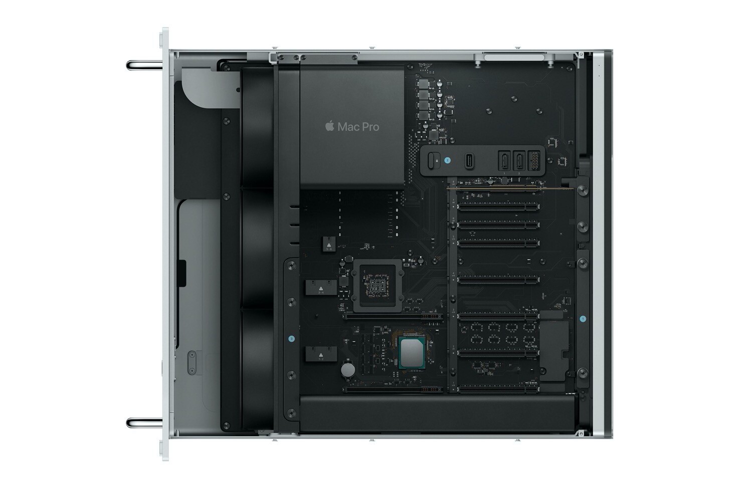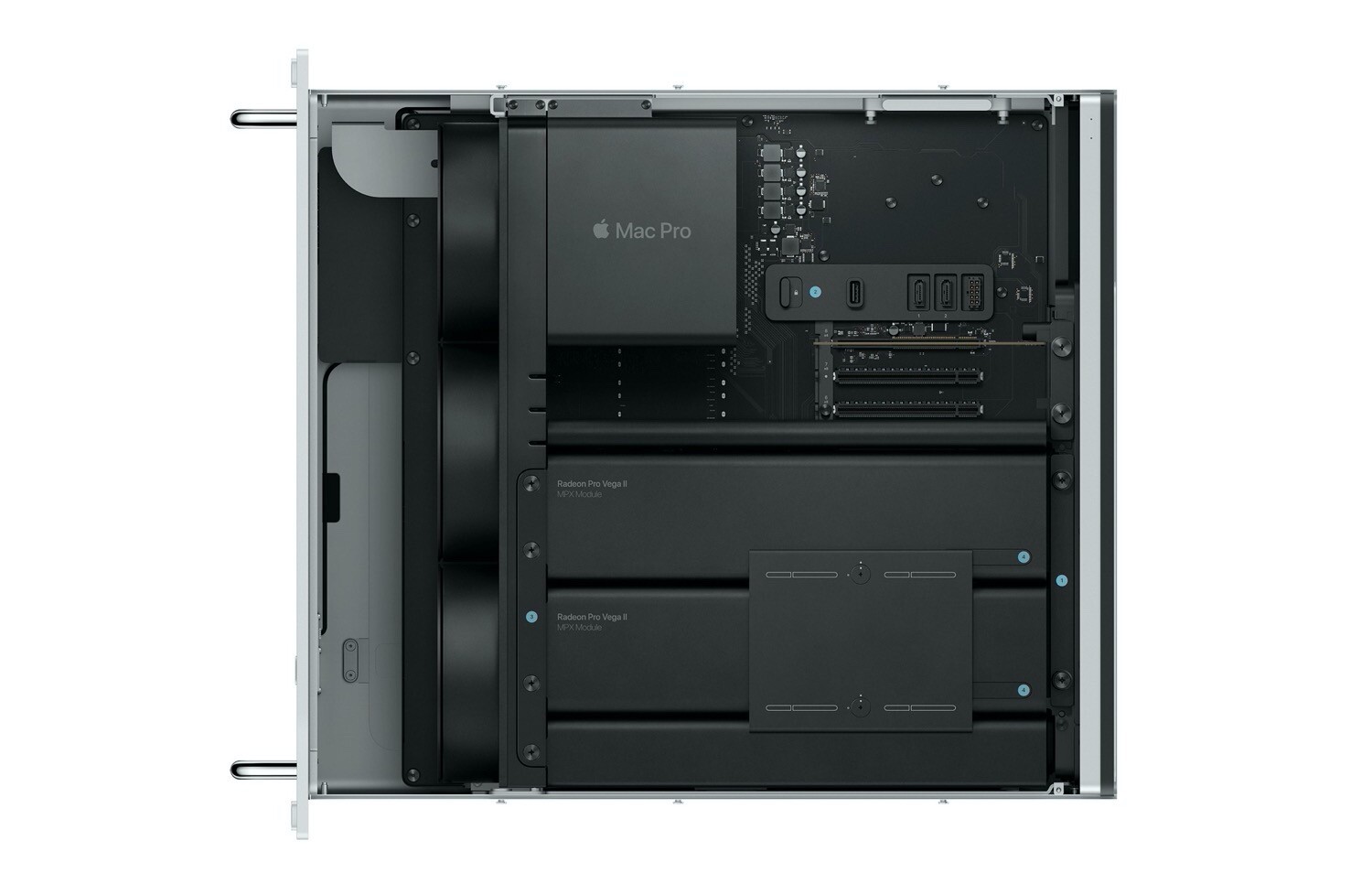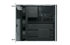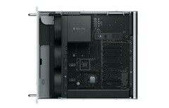 Dabei verzichtet Apple auf die Standfüße, dafür erhält man Rack-Befestigungsschienen aus Stahl, auf die Komponenten lässt sich über die Handgriffe an der Oberseite zugreifen. Zur Standard-Ausstattung gehören nach wie vor ein Intel Xeon W-Prozessor mit 8 Kernen, 32 GB DDR4 ECC-Arbeitsspeicher, eine AMD Radeon Pro 580X mit 8 GB GDDR5-Grafikspeicher und eine 256 GB fassende SSD.