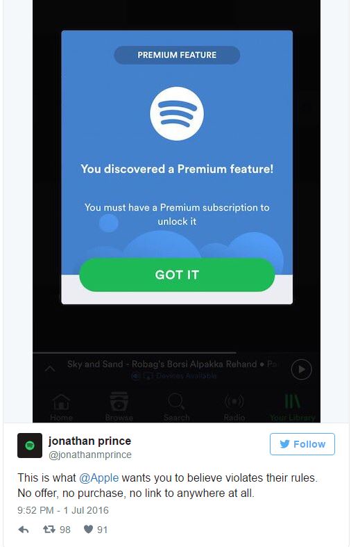 Apple behauptet weiters, die von Spotify eingebrachten App-Updates hätten den Link auf das In-App-Bezahlsystem von Apple entfernt und durch ein Premium-Sign-Up-Service von Spotify ersetzt. Das widerspreche eindeutig den App-Store-Regeln, deswegen seien die Updates abgelehnt worden. Dem widersprach Spotify vor wenigen Stunden und zeigte via Twitter ein Bild des angeblich eingebauten Sign-up-Links. Über einem weiteren Tweet stellte Spotify klar, dass ein Klick auf den "Got it" Button keine externe Webseite öffne, sondern zurück auf die vorherige Seite führe. Die öffentlich ausgetragene Diskussion dürfte in den nächsten Tagen also weitergehen.