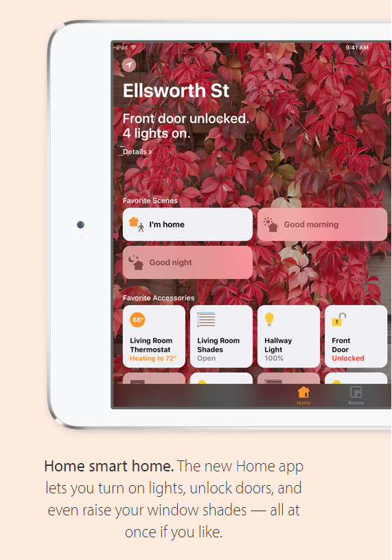 Das Steuerungssystem Homekit erhält endlich eine einheitliche App zur Bedienung von Hauselektronik und Sensoren unterschiedlicher, kompatibler Hersteller. Apple nennt diese zentrale Steuerungs-App schlicht Home. Auch Home wird am Lockscreen als eine Art Widget zur Verfügung stehen und somit auch die Steuerung von Hauselektronik direkt vom Lockscreen aus im Control Center ermöglichen. Als Beispiel wurde ein Video der Eingangstüre direkt am Lockscreen gezeigt, mit anschließendem Öffnen der Haustüre. Szenen sollen bestimmte Szenarien konzertiert ausführen, beispielsweise abends alle Lichter ausschalten, die Rolläden runterfahren und die Türen verschließen. Natürlich alles auch mit Siri-Integration per Sprache steuerbar. Home kann auch automatische Aktionen auf Basis von Geoinformationen setzen, beispielsweise das Garagentor öffnen sobald man zu Hause ankommt.
