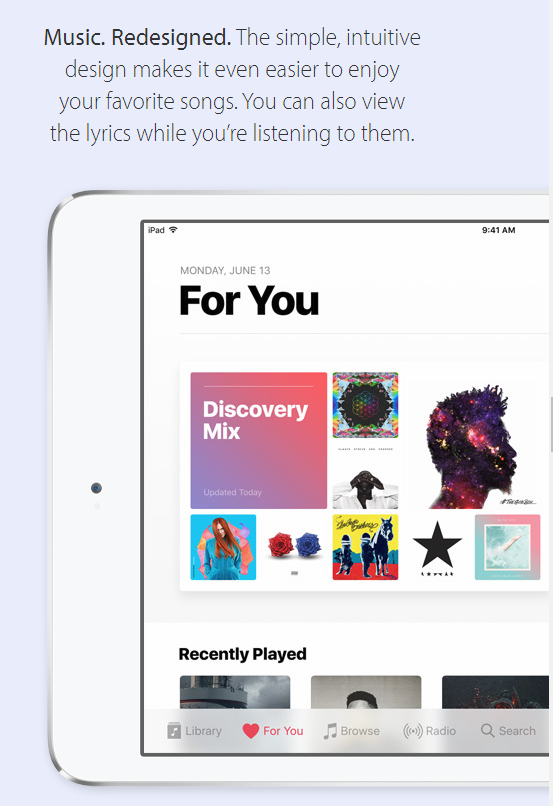 Wie prognostiziert, wird Apple Music in iOS 10 komplett redesignt und in der Bedienung vereinfacht. Nach dem Start der App steht die Musik-Library nun direkt zur Verfügung, darunter folgen neben den Sortier-Möglichkeiten auch der einfache Zugriff auf die bereits am Gerät selbst geladene Musik, beispielsweise praktisch wenn man offline ist. In den Informationen zum laufenden Song finden sich nun auch Songtexte. Die "For You" Ansicht zeigt Empfehlungen aufgrund bisheriger Vorlieben, in der "Browser" Ansicht kann nach neuer Musik gesucht werden. Als Letztes folgt Apple Radio, Connect ist dagegen aus der prominenten Position verschwunden und nur mehr in den "For You" Empfehlungen zu finden.