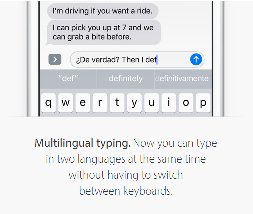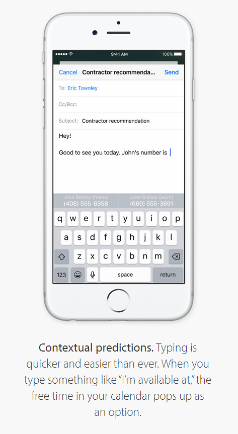 Auch bei der Apple-Tastatur wird Siri insofern aktiv, als die Tastatur ab iOS 10 durch intelligente Vorschläge aufgewertet wird. Sie kann beispielsweise Kalender-, Kontakt- oder Ortsdaten vorschlagen wenn in einer Konversation entsprechende Informationen verlangt werden. Auch die Textänderungs-Vorschläge sollen intelligenter werden und sich besser auf die jeweiligen Unterhaltungen anpassen. Selbst der Wechsel der Eingabesprache soll nahtlos erkannt werden, ohne die Sprache explizit umstellen zu müssen.