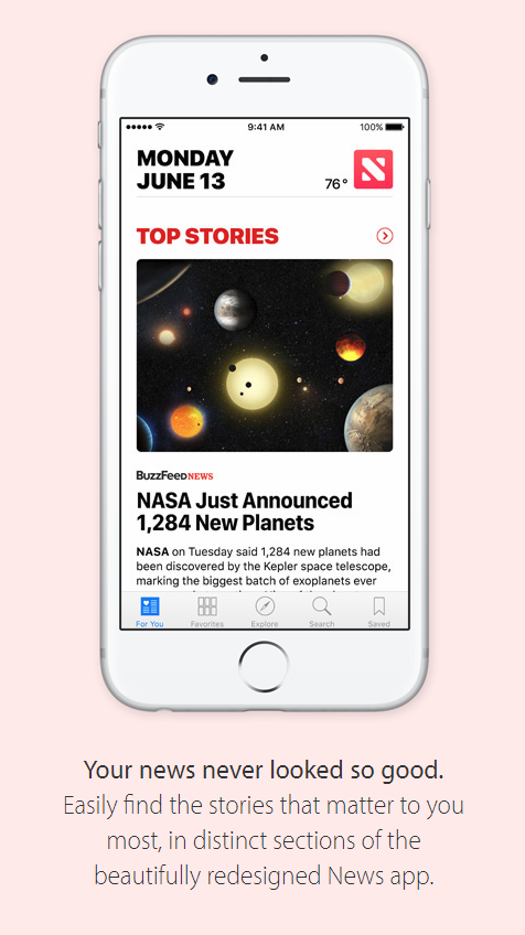 Die News App wird um Zeitungs- und Zeitschriften-Abos erweitert und wurde ebenfalls einem Redesign unterworfen. Die Ansicht wird um Topics, also Themen erweitert, die je nach persönlicher Vorlieben auch automatisch von der App erweitert werden können. Trending Stories sollen beliebte Geschichten mehr in den Vordergrund stellen. News kann nun aktuelle Schlagzeilen auch als Notifications direkt auf dem Lockscreen platzieren. Ob die News-App in Zukunft auch vermehrt auf deutschsprachige Inhalte adaptierbar sein wird, wurde naturgemäß zur Keynote nicht erwähnt.
