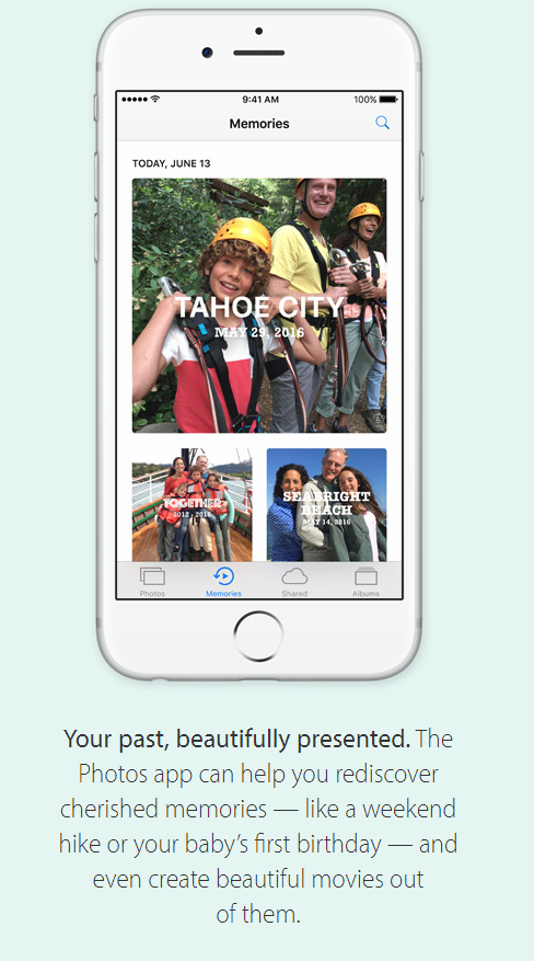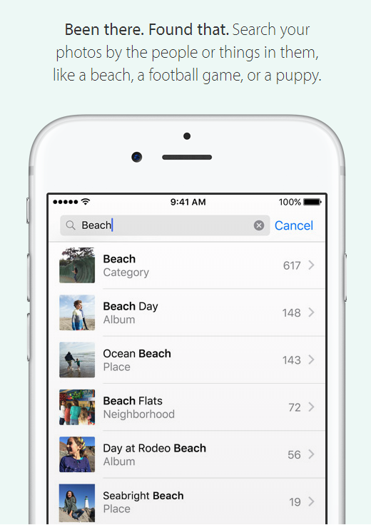 Die in iOS integrierte Photos-App wird, ähnlich wie Google Photos um Gesichts-, Objekt- und Szenen-Erkennung erweitert, allerdings betonte Craig mehrmals im Zuge seiner Präsentation, dass Apple die Privatsphäre und Sicherheit seiner Kunden wichtig sei und diese Erkennungsfunktionen daher ausschließlich auf dem Gerät selbst und nicht in der Cloud ablaufen. Die Bildersuche wird dadurch stark aufgewertet und kann nun Fotos nach bestimmten Stichworten durchsuchen. Eine Memories genannte Funktion gruppiert Bilder und Videos nach bestimmten Ereignissen, beispielsweise einem Ausflug. Videomontagen dieser gruppierten Fotos und Videos können in unterschiedlicher Länge und Stimmung automatisch zusammengesetzt und geteilt werden.
