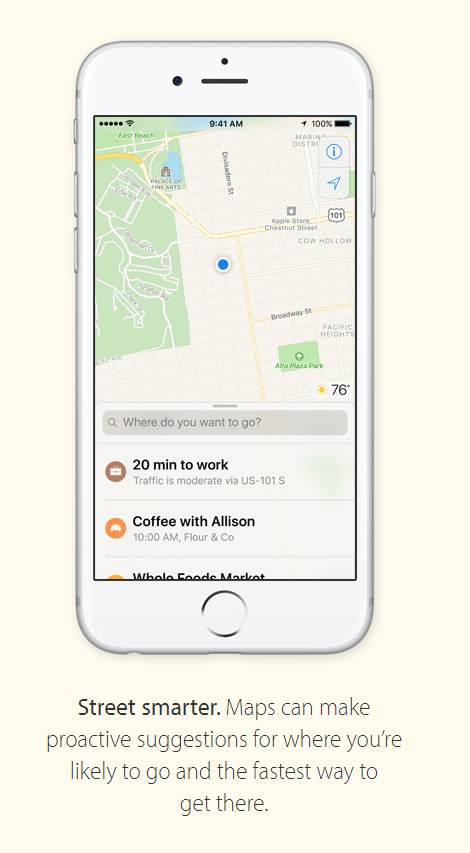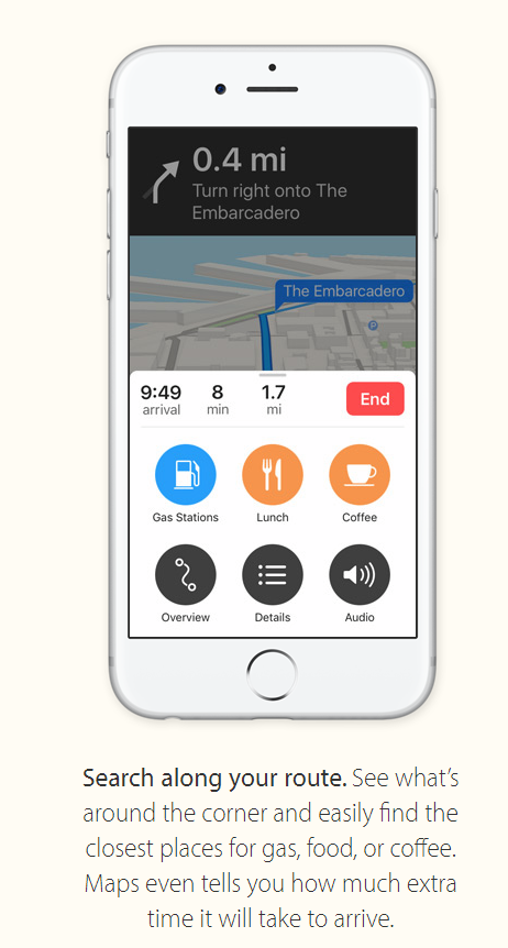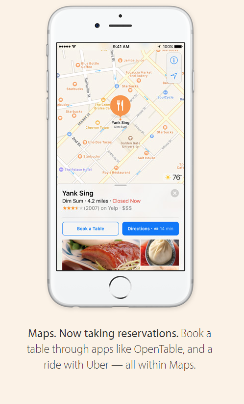 Apple Maps kann proaktiv auf Stauwarnungen oder Bauarbeiten hinweisen und Ausweichrouten vorschlagen. Eine dynamische Sicht ändert während einer Fahrt die Perspektive, je nach Anforderung. Die Suche wird erweitert und zeigt nun Vorschläge für Orte wie Restaurants entlang einer Route. Auch Apple Maps wird für Third-Party-Entwickler geöffnet, Taxi-Unternehmen oder Bezahldienste sollen direkt aus Maps heraus ihre Dienste anbieten können, ohne Maps verlassen zu müssen. Alle Neuerungen stehen natürlich auch auf kompatiblen Autos mit Carplay zur Verfügung.