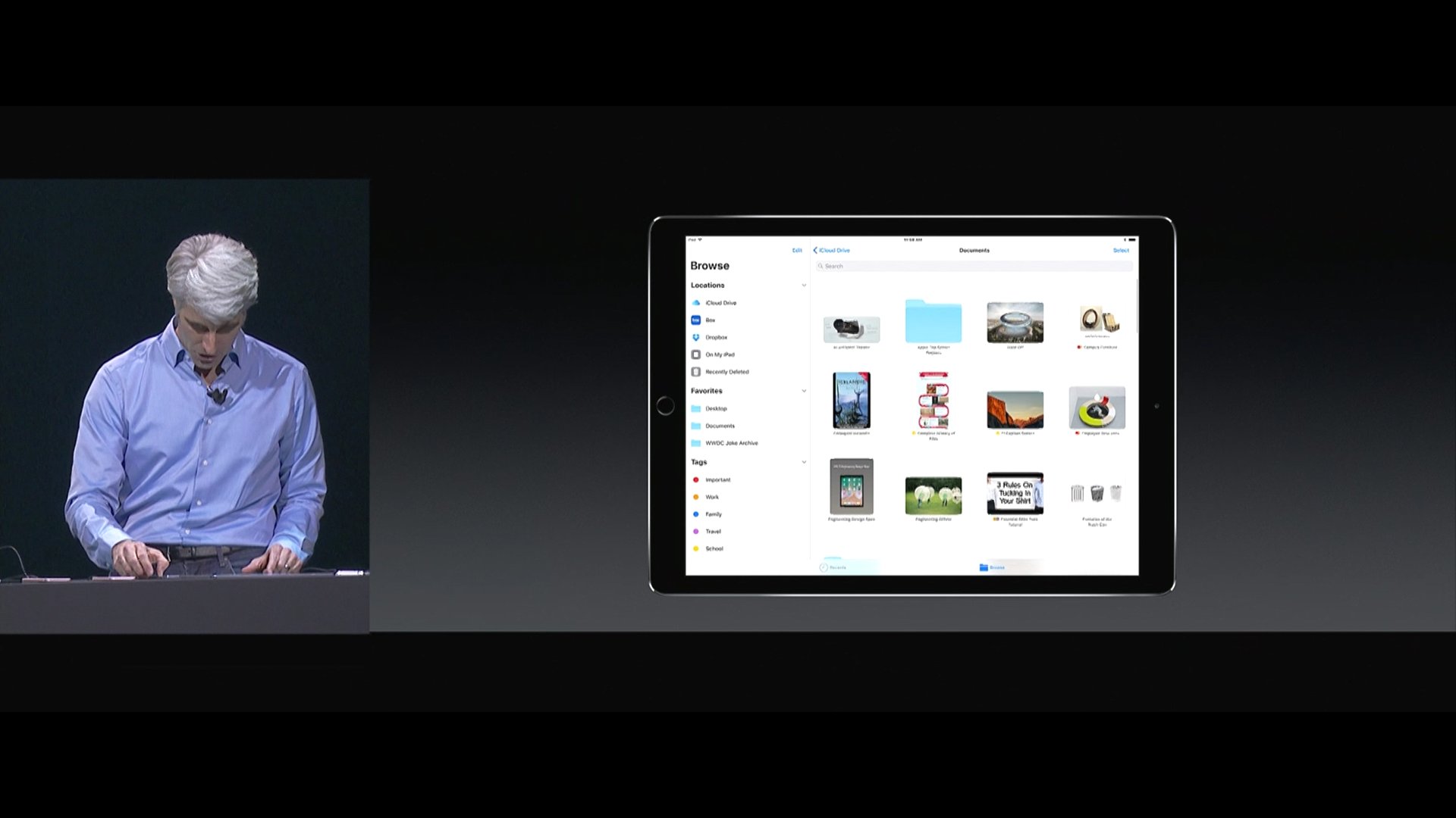 - Files: Wie bereits vorab geleakt, wird Apple zukünftig <strike>exklusiv auf iPads</strike> (Update: Files wird auch auf iPhones verfügbar sein) einen eingeschränkten Zugriff auf das Filesystem der Tablets und Smartphones erlauben. Neben Nutzerdaten auf dem Gerät selber und allen mit der iCloud vernetzten Apple-Geräten (wohl nicht mit Windows-Rechnern, zumindest wurde das bisher nicht erwähnt), dürfen auch andere Cloudanbieter wie Dropbox eingebunden werden. Über OneDrive wäre so auch ein Zugriff auf Daten von Windows-Rechnern möglich, das geht aber natürlich auch mit anderen unterstützten Cloudanbietern. Files können als Favoriten markiert oder getaggt werden, es gibt auch eine Ansicht der zuletzt benutzten Daten über Geräte hinweg.