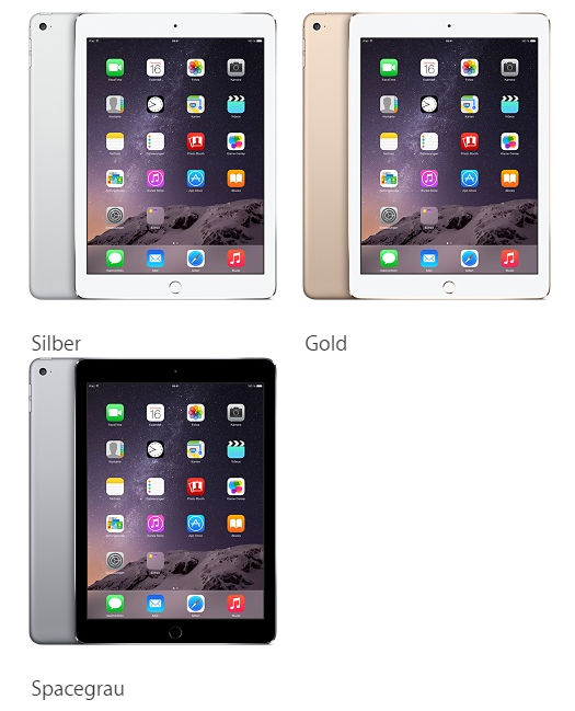 Das iPad Air 2 wird nächste Woche in den Farben Silber, Space Grau und Gold in Deutschland erscheinen. Die Preise: 490 Euro für das 16-GB-Modell, 590 Euro für das 64-GB-Modell und 690 Euro für das 128-GB-Modell. Für das mobile Internet via LTE wird jeweils ein Aufpreis von 120 Euro fällig.