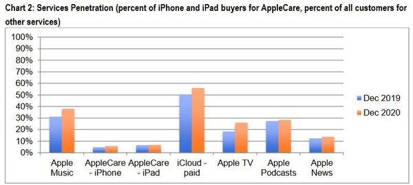 Apple konnte auch bei einigen seiner Services wie kostenpflichtigem iCloud-Speicher, Apple TV und den Apple Music Streaming-Diensten im Vergleich zum gleichen Zeitraum des Jahres 2019 ordentlich zulegen (Chart 2). Die Bereiche Apple Music und Apple TV sind im letzten Dezember-Quartal deutlich gewachsen, über ein Drittel der Apple-Kunden haben mittlerweile den Musik-Streaming-Dienst von Apple gebucht, und über ein Viertel Video-Streaming, so Mike Levin, CIRP-Partner und Mitbegründer. Apple habe zwar schon immer eine vergleichsweise ordentliche Akzeptanz seiner kostenpflichtigen iCloud-Services, allerdings tue sich Apple noch immer schwer beispielsweise seine AppleCare-Garantien zu verkaufen.