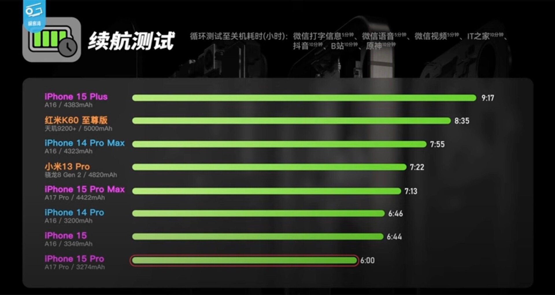 Laut Apple hält der Akku des iPhone 15 Pro und des iPhone 15 Pro Max in etwa gleich lange wie bei den jeweiligen Vorgängermodellen, und das, obwohl die Geräte minimal größere Akkus und den brandneuen Apple A17 Pro besitzen, der in einer Strukturbreite von nur 3 nm hergestellt wird, und somit theoretisch effizienter arbeiten sollte.