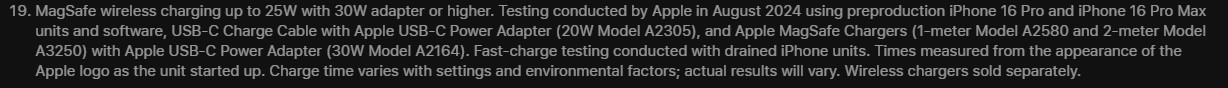 Im offiziellen Datenblatt auf Apples US-Webseite und der dazugehörigen Fußnote (siehe Screenshot unten für die Pro-Modelle) ist von diesem Schnelllade-Upgrade nichts zu lesen, auch im Launch-Livestream oder der Pressemitteilung war es kein Thema. Hier werden wohl erst die Tests mit den globalen iPhone 16 Modellen zeigen, ob wir künftig breit verfügbare USB-PD-Ladegeräte nutzen können, um die neuen iPhones schneller zu laden als bisher.