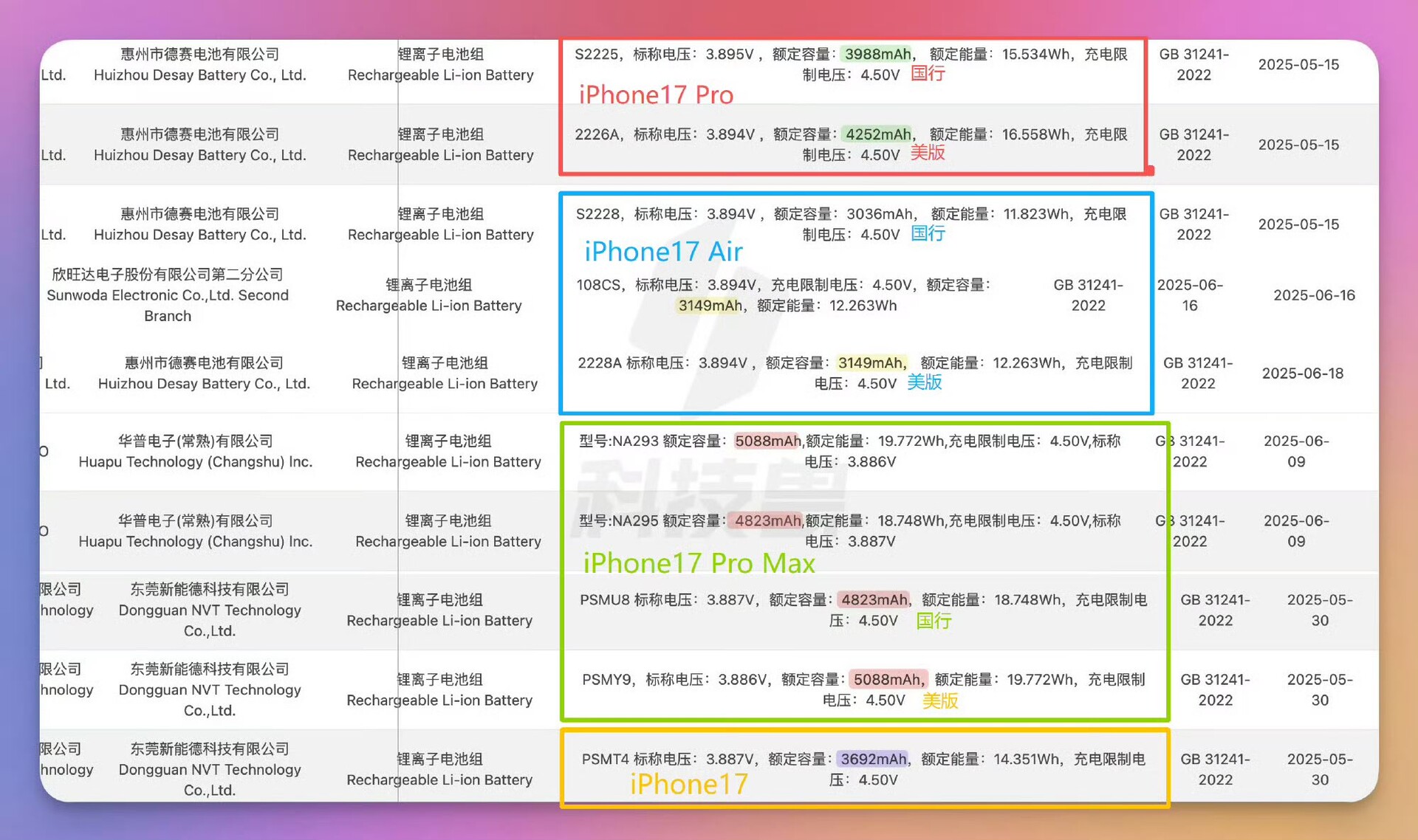 In den USA gib es schon in den letzten drei Jahren keine iPhones mit Sim-Karten-Slot mehr, bis dato hat Apple diesen zusätzlichen Platz aber nicht für mehr Akkukapazität genutzt, was sich in diesem Jahr offenbar ändert. Die Informationen stammen aus einer Akku-Zertifizierung in China (siehe Screenshot unten vom bekannten Apple-Leaker ShrimpApplePro auf X) und dürften daher recht sicher sein. Demnach werden iPhone 17 Air, iPhone 17 Pro sowie iPhone 17 Pro Max ohne Sim-Slot jeweils um die 5 Prozent mehr Akkukpazität bieten als die korrespondierenden Modelle mit dem Einschub für Sim-Karten.