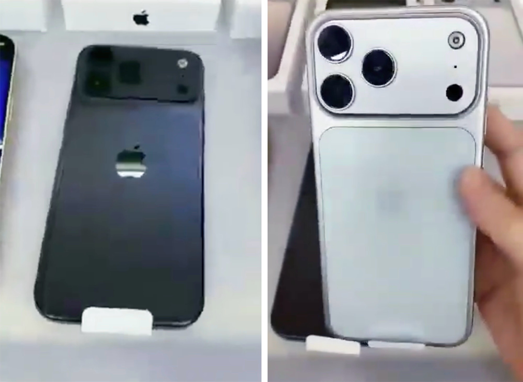Der Nachfolger des iPhone 16 Pro Max (ca. 1.279 Euro auf Amazon) ist in den Farben Weiß, Schwarz und Grau zu sehen, die bunteren Varianten in Orange und Blau sind noch nicht zu sehen. Apple setzt wie erwartet auf ein deutlich größeres Kameramodul, das fast über die gesamte Breite des Smartphones reicht. Die drei Kameras werden gleich wie beim Vorgängermodell angeordnet, an der gegenüberliegenden Seite des Kameramoduls sind ein Mikrofon und ein LED-Blitz zu sehen, wobei Letzterer ungewöhnlich aussieht – möglicherweise überarbeitet Apple den Blitz, um die Helligkeit oder die Reichweite zu erhöhen.