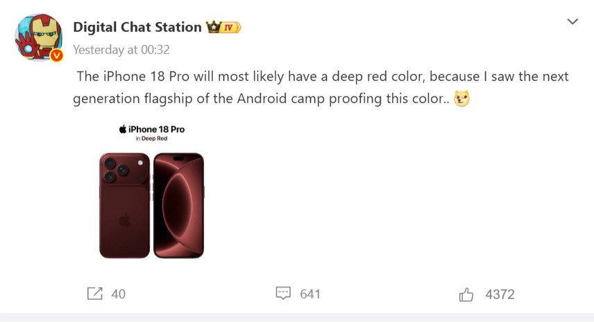 Und das kam offenbar gut an, denn in den Entwicklungslabors wird bereits an der nächsten Farbvariante für den Herbst 2026 gearbeitet, wie aktuell Digital Chat Station auf Weibo betont. Der gewöhnlich sehr zuverlässige Leaker scheint jedenfalls davon auszugehen, dass die Farbe Dunkelrot oder Samtrot bei Apple zur primären Farboption des iPhone 18 Pro und iPhone 18 Pro Max auserkoren wurde, denn erste Hersteller von Android-Flaggschiffen scheinen sich bereits darauf festzulegen.