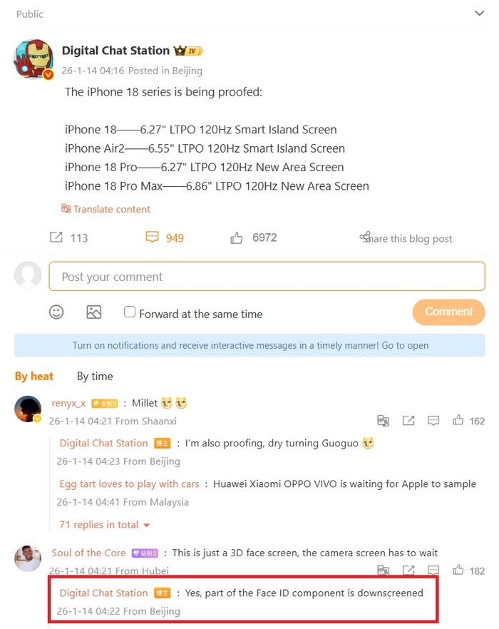 Es ist noch etwas früh für verlässliche iPhone 18 Leaks, doch die wieder in China produzierten Apple-Smartphones des Jahres 2026 finden sich durchaus bereits in dem einen oder anderen Testlabor wieder, wie aktuell der gewöhnlich sehr zuverlässige Leaker Digital Chat Station betont. Seinen aktuellen Angaben auf Weibo zufolge (siehe auch maschinell übersetzten Screenshot unten) besteht die iPhone 18 Serie - abgesehen vom ersten iPhone Fold und dem iPhone 18e - wie gehabt aus vier Handys, wobei offenbar nur die beiden Pro-Modelle eine sichtbare Neuigkeit im Displaybereich bieten werden.