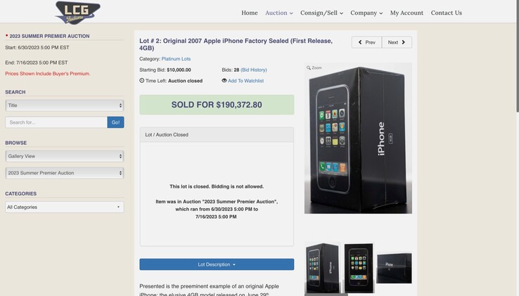 LCG Auctions hat vom 30. Juni bis zum 16. Juli ein iPhone der ersten Generation versteigert, das für ein Startgebot von 10.000 US-Dollar angeboten wurde. Das Auktionshaus hat einen geschätzten Verkaufspreis von 50.000 bis 100.000 US-Dollar angegeben. Zum Vergleich: Der bisherige Rekordpreis von 63.000 US-Dollar wurde in einer Auktion im Februar erzielt.