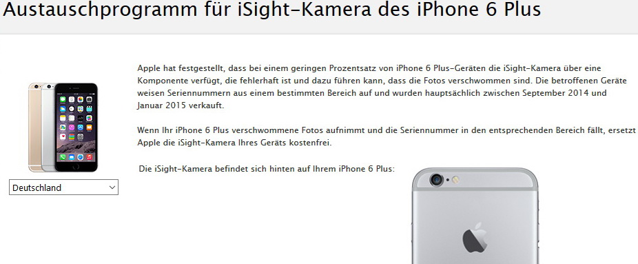 Apple hat für das iPhone 6 Plus eine weltweite Austauschaktion gestartet. Grund: Eine nicht näher bezeichnete Komponente der 8 MP iSight Hauptkamera an der Rückseite des iPhone 6 Plus ist fehlerhaft und sorgt laut Apple bei einem Teil der Produktchargen für verschwommene Bilder. Vermutlich handelt es sich hierbei um die optische Bildstabilisierung (OIS). Denn das iPhone 6 ohne OIS ist von diesen Problemen nicht betroffen.