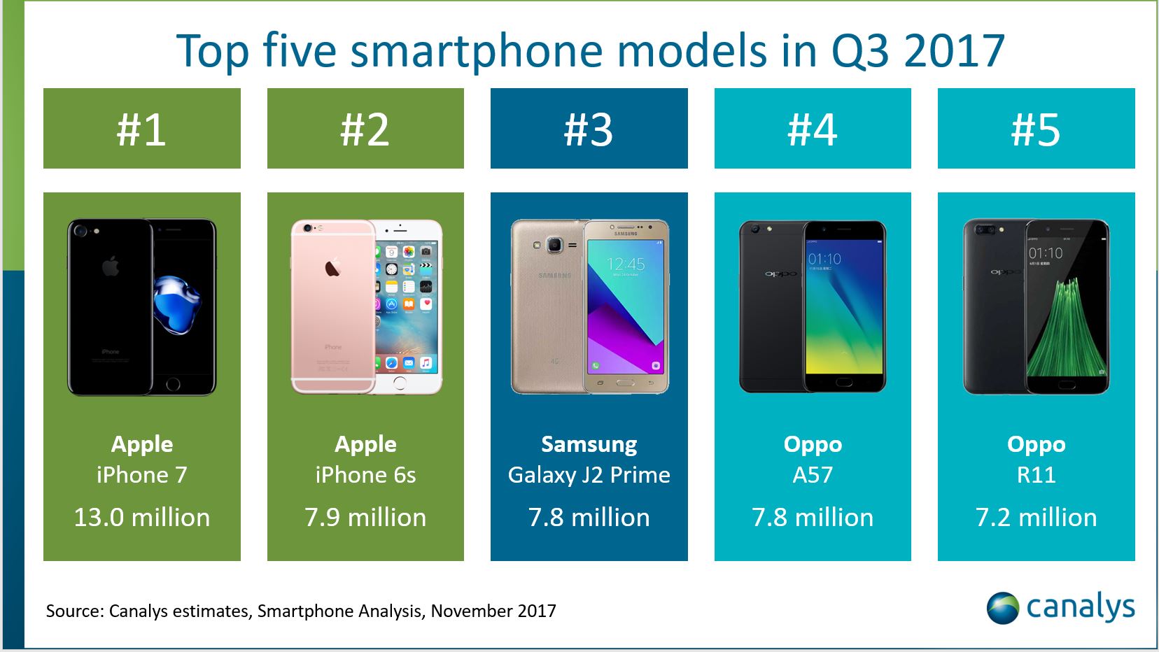 Auf Platz 2 folgt ein weiteres iPhone von Apple - das iPhone 6s mit einem Liefervolumen von 7,9 Millionen. Erst dahinter taucht ein Smartphone des Branchenriesen Samsung in den Topcharts auf: Das Galaxy J2 Prime sichert sich mit 7,8 Mio. Einheiten Rang 3. Für das Oppo A57 weist Canalys auf Position 4 ebenfalls 7,8 Mio. Geräte aus. Von seinem R11 konnte die BBK-Tochter Oppo global 7,2 Millionen Smartphones absetzen.
