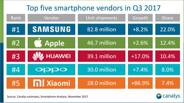 Canalys zufolge machte Xiaomi mit 28,0 Mio. abgesetzten Einheiten im 3. Quartal 2017 einen enormen Sprung nach oben. Vor allem in Indien verkaufte Xiaomi in den vergangenen Monaten sehr viele Geräte. Im Hersteller-Ranking von Canalys schließt Xiaomi mit einem Marktanteil von 7,4 Prozent weiter zu Oppo auf.