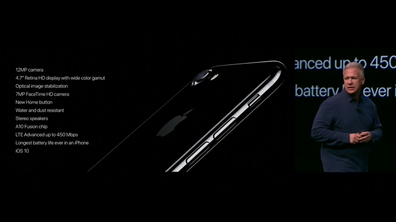 Das wohl wichtigste Update für die meisten User dürften die Kameras im iPhone 7 darstellen. Nicht nur die Frontkamera wurde überarbeitet und bietet nun 7 MP mit einer F/2.2 Blende, die meiste Arbeit floss in die Hauptkamera auf der Rückseite. Schon das kleinere iPhone 7 hat Apple komplett überarbeitet und integriert nun eine 6P-Linse mit 12 MP bei einer F/1.8 Blende und optischer Bildstabilisierung (OIS). Phil Schiller versprach einen schnelleren Sensor, bis zu 50 Prozent hellere Bilder und drei mal höhere Belichtungszeiten. Auch der True Tone Flash wurde überarbeitet und besteht jetzt aus vier LEDs, die 50 Prozent mehr Licht produzieren.