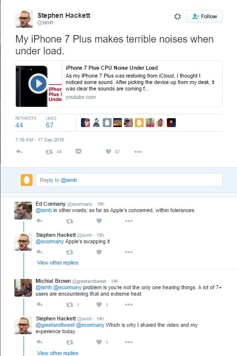 Stephen Hackett, einer der Ersten, der auf Twitter darüber geschrieben hatte, bekam vom Apple Support den Rat, das Gerät in einem Apple Store umzutauschen, wobei die derzeit schlechte Versorgung mit iPhone 7-Modellen vermutlich gegen einen raschen Ersatz spricht, wie 9to5Mac schreibt. Wir testen iPhone 7 und iPhone 7 Plus ja selbst gerade und konnten das Geräusch bisher nicht reproduzieren, halten euch aber am Laufenden. Habt Ihr das Geräusch bei euren iPhone 7-Modellen schon selbst gehört? Wenn ja, in welcher Situation? Bei einem bestimmten Benchmark/Programm oder nur sporadisch? Lasst es uns in den Kommentaren wissen!