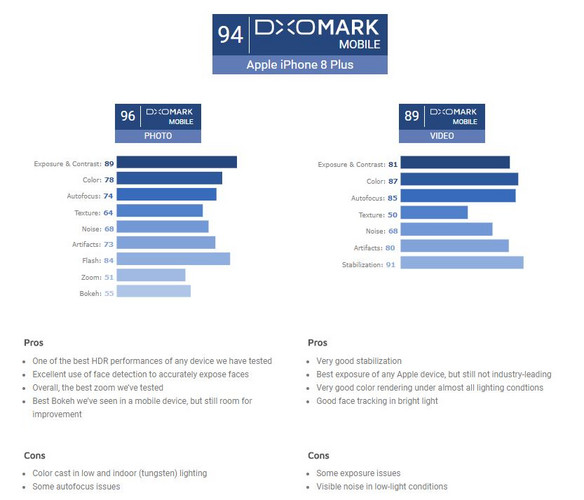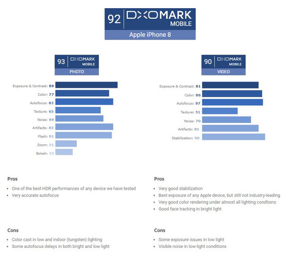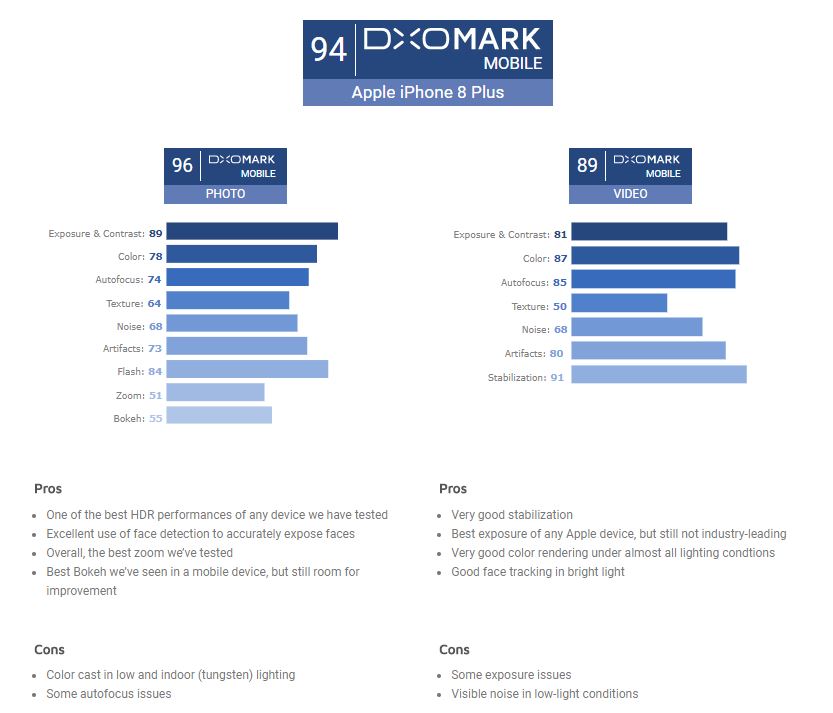 Aber wenden wir uns wieder dem neuen iPhone-Duo zu: Das iPhone 8 erreicht den besten Wert unter Single-Lens-Smartphone-Kameras wohl vor allem durch seine hervorragenden Auto-HDR-Fähigkeiten und den vergleichsweise guten Autofokus. Im Videobereich sieht DxOMark allerdings noch Verbesserungspotential, hier verteidigt das Pixel Phone von Google weiterhin seinen Spitzenplatz. Das iPhone 8 Plus brilliert in den Testaufnahmen von DxOMark ebenfalls mit seinen hervorragenden HDR-Algorithmen, dem besten Zoom im Testfeld sowie authentisch wirkenden Bokeh-Effekten, die im Vergleich zum iPhone 7 Plus noch mehr an eine echte DSLR erinnern sollen.