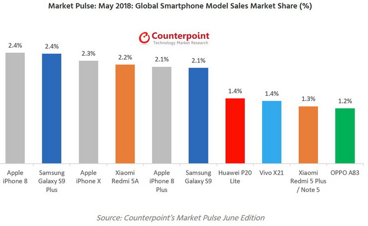 Die Marktforscher von Counterpoint Research haben die Auswertung ihrer Market-Pulse-Marktanalyse für den Monat Mai 2018 veröffentlicht. Laut der neuesten Studie von Counterpoint hat sich Apple mit dem iPhone 8 den ersten Platz im Ranking der weltweit meistverkauften Smartphones zurückgeholt.