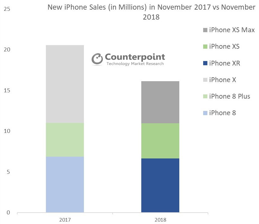 Das iPhone XR war im November 2018 das meistverkaufte iPhone-Modell von Apple. Ein Jahr zuvor war das teurere iPhone X im November 2017 das meistverkaufte iPhone und sorgte für fast 50 Prozent mehr Absatzvolumen im Vergleich zu den jüngsten iPhone-XR-Zahlen. Der Gesamtabsatz von Apples neuer iPhone-Generation wurde im November 2018 vor allem durch schwächere Verkäufe in den Regionen Asien/Pazifik (ohne China und Indien), Europa und den USA stark beeinträchtigt.