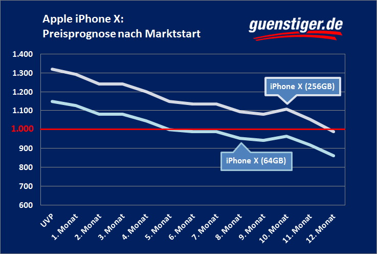 Die Preisrecherche-Experten gehen davon aus, dass das iPhone X 64GB erst nach etwa 5 Monaten unter die 1.000-Euro-Marke fallen wird. Die größere Speichervariante mit 128 GB wird diese Hürde wahrscheinlich sogar erst nach 1 Jahr unterschreiten. Die bisherigen iPhone-Modelle der Serien iPhone 6, iPhone 6s, iPhone 7 sowie deren Plus-Varianten wurden 3 Monate nach ihrer Einführung im Internet um etwa 6 Prozent günstiger angeboten. Nach 4 Monaten waren es 9 Prozent und nach 5 Monaten 13 Prozent.