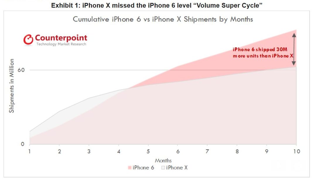 Das kumulative globale Liefervolumen für das iPhone X erreichte demnach innerhalb von 10 Monaten nach dem Start Ende August 2018 rund um den Globus 63 Millionen Einheiten. Im Vergleich dazu benötigte Apple während der heißen Phase des iPhone 6 Smartphones nur 6 Monate, um nach dem Start 2014 ein ähnliches Volumen zu erreichen. Vom iPhone 6 hat Apple in den ersten 10 Verkaufsmonaten rund 30 Millionen mehr Einheiten als von seinem iPhone X ausgeliefert.