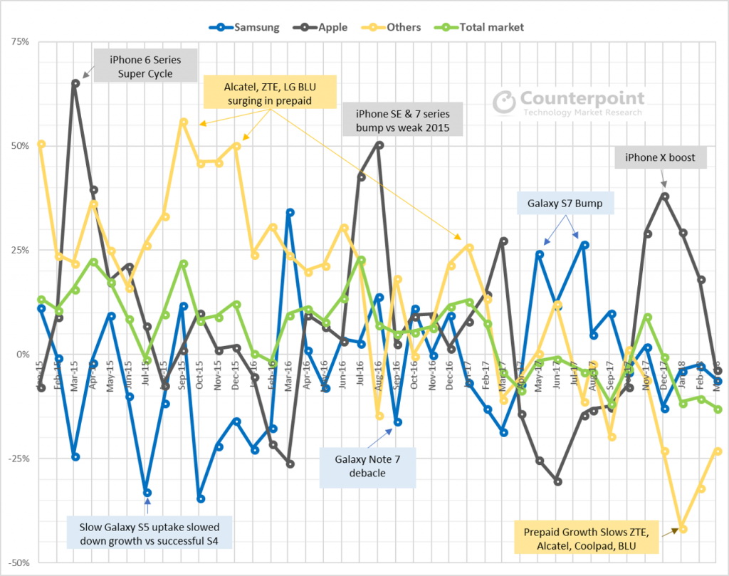 Die schwächer Nachfrage wirkt sich auch auf die Verkaufszahlen der Hersteller aus. Hinzu kommen Sanktionen der US-Regierung gegen chinesische Smartphone-Hersteller wie Huawei und ZTE. Die Folgen des Handelskriegs schlagen sich auch in den Marktzahlen von Counterpoint Research nieder. Der große Gewinner im ersten Quartal 2018 war Apple mit dem iPhone. Kein anderes Smartphone verkaufte sich in den USA so gut, wie das iPhone 8 und iPhone X.