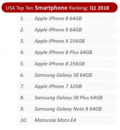 Im USA Top 10 Smartphone Ranking für Q1/2018 dominiert Apple mit dem iPhone 8, iPhone 8 Plus und iPhone X sogar die ersten fünf Plätze. Die Top 5 besteht nur aus iPhone 8 64 GB (Rang 1), iPhone X 64 GB (2), iPhone X 256 GB (3), iPhone 8 Plus 64 GB (4) sowie iPhone 8 256 GB auf Position 5. Erst auf Platz 6 kommt dann Samsung mit dem Galaxy S8 64 GB. Galaxy S9 und Galaxy S9+ kommen in der US-Topliste gar nicht vor.