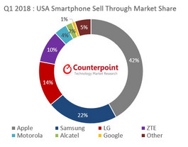 Das erste Quartal im Jahr 2018 lief für den Smartphone-Markt in den USA eher schleppend. Im Vergleich zum Vorjahreszeitraum Q1/2017 mit einem Absatz- und Liefervolumen von 43,7 Millionen Smartphones zählten die Marktanalysten von Counterpoint Research für das 1. Quartal 2018 nur noch 38,7 Millionen Geräte. Das entspricht einem Rückgang um 11,4 Prozent. In den vergangenen drei Jahren lag der US-Absatz in den entsprechenden Quartalen immer jeweils über 40 Mio.