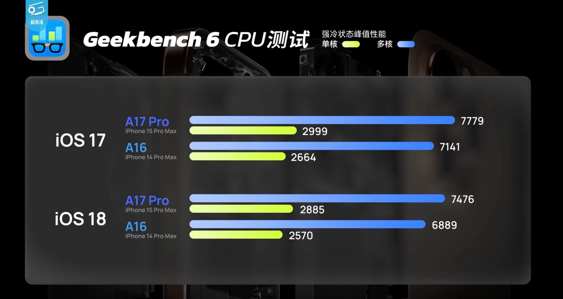 Im Test fällt das Geekbench-Ergebnis des iPhone 15 Pro Max im Multi-Thread-Benchmark nach dem Update 3,9 Prozent niedriger aus, die Single-Thread-Leistung um 3,8 Prozent. Die Leistung des iPhone 14 Pro Max sinkt jeweils um 3,5 Prozent. Diese Resultate lassen sich durch einen Blick in die Geekbench-Datenbank schnell verifizieren – während der Apple A17 Pro in unseren Tests im Schnitt 2.915 Punkte (Single-Thread) respektive 7.222 Punkte (Multi-Thread) erzielen konnte, erreichen das iPhone 15 Pro und das iPhone 15 Pro Max in neueren Benchmark-Durchgänge mit iOS 18 kaum 2.800 bzw. 7.000 Punkte.