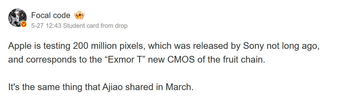 Laut Weibo-User Fixed Focus Digital (aka Focal code) testet Apple ein künftiges iPhone mit einem bis dato unveröffentlichten Sony-Sensor, der ebenfalls 200 Megapixel bieten wird und das laut früherer Hinweise mit größerer Sensorfläche als aktuell bei Samsung üblich. Die Südkoreaner bieten mittlerweile ja einige 200 Megapixel Sensoren der ISOCELL HP-Serie an, bisher maximal mit 1/1.3 Zoll Sensorgröße. Der neue Sony 200 MP Sensor soll in die Exmor T Kategorie fallen, wäre damit also in einer Klasse mit der Hauptkamera des aktuellen Sony Xperia 1 VII (hier bei Amazon erhältlich)