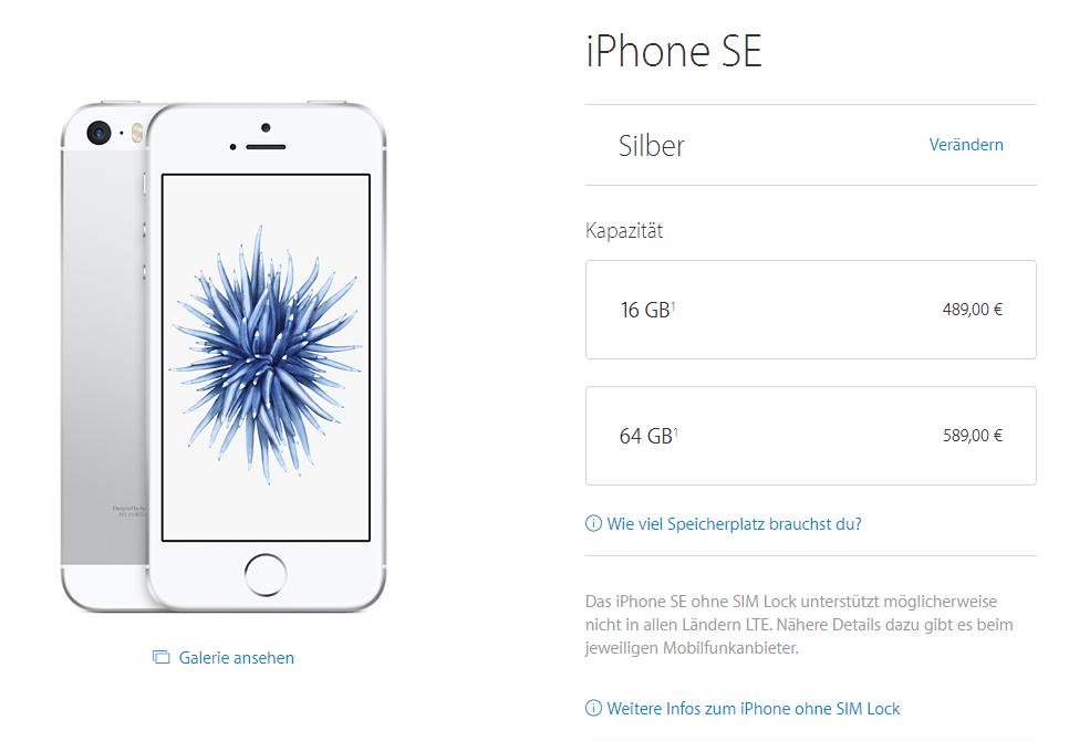 Erste Lieferengpässe im Apple Shop versprechen jedenfalls schon jetzt einen großen Erfolg. Das iPhone SE ist in Österreich, wohl wegen der geringeren Festplattenabgabe in beiden Modellvarianten um 10 Euro günstiger als in Deutschland zu haben. Die 16 GB Variante kostet in Österreich 479 Euro, in Deutschland demnach 489 Euro. Die 64 GB Variante ist jeweils um 100 Euro teurer. Da iPhones traditionell keinen erweiterbaren Speicher besitzen, greifen viele Konsumenten wohl auch beim iPhone SE zur 64 GB Variante.
