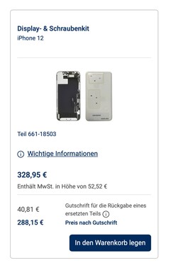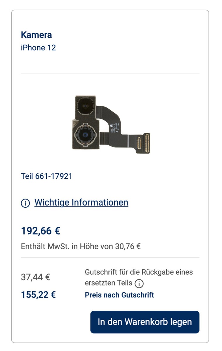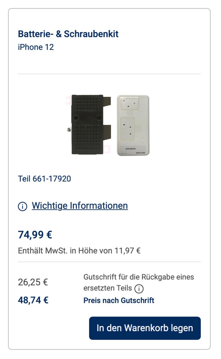Laut Apples Pressemeldung sind die Preise für die Ersatzteile dieselben, die auch Service-Partner bezahlen. Ganz günstig sind die Komponenten aber nicht. Ein Ersatzakku für ein iPhone 12 kostet beispielsweise 74,99 Euro, während im Apple Store für den Tausch des Akkus inklusive Ersatzteil und Arbeit 75 Euro fällig werden. Immerhin erhalten Kunden eine Gutschrift in Höhe von 26,25 Euro, wenn der alte Akku zum Recyceln zurückgeschickt wird.