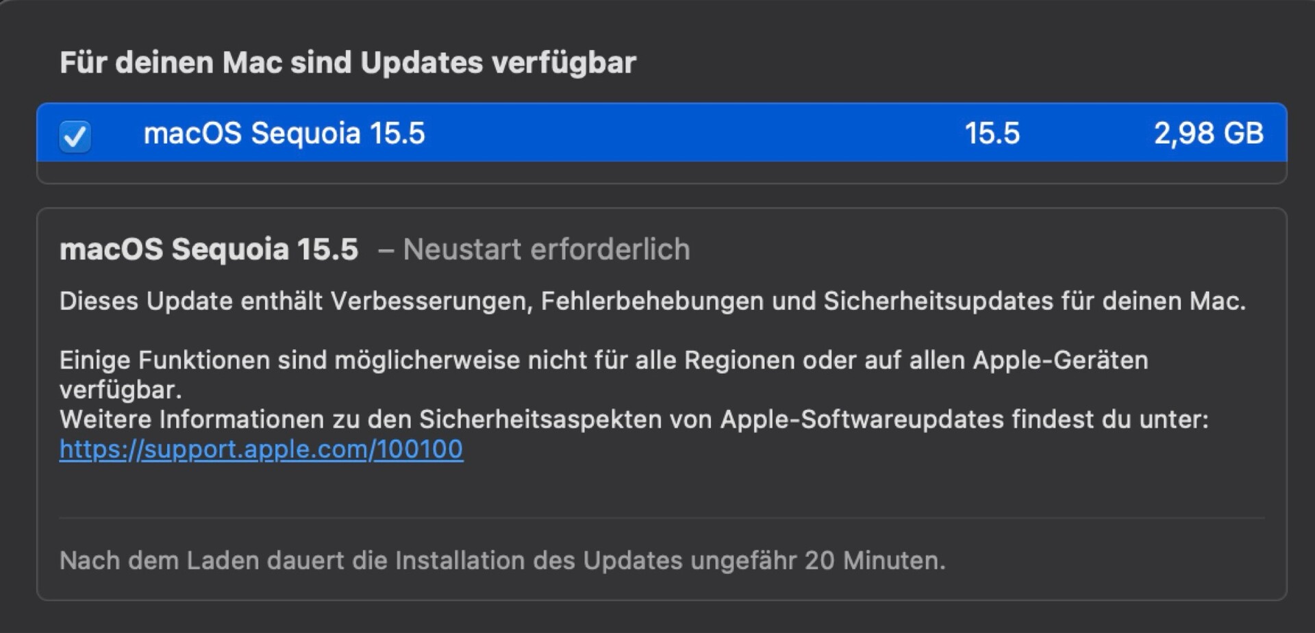 Das Update auf macOS 15.5 ist mit 2,98 GB entsprechend größer, bringt aber nur die Neuerung mit, dass Eltern beim Umgehen der Bildschirmzeit-Einschränkung benachrichtigt werden. watchOS 11.5 führt ein neues Pride-Zifferblatt ein, erlaubt es, Drittanbieter-Inhalte in der Apple TV App zu kaufen, und behebt ein Problem, bei dem Benachrichtigungen am iPhone nicht richtig angezeigt werden konnten, wenn die Apple Watch vollständig geladen war.
