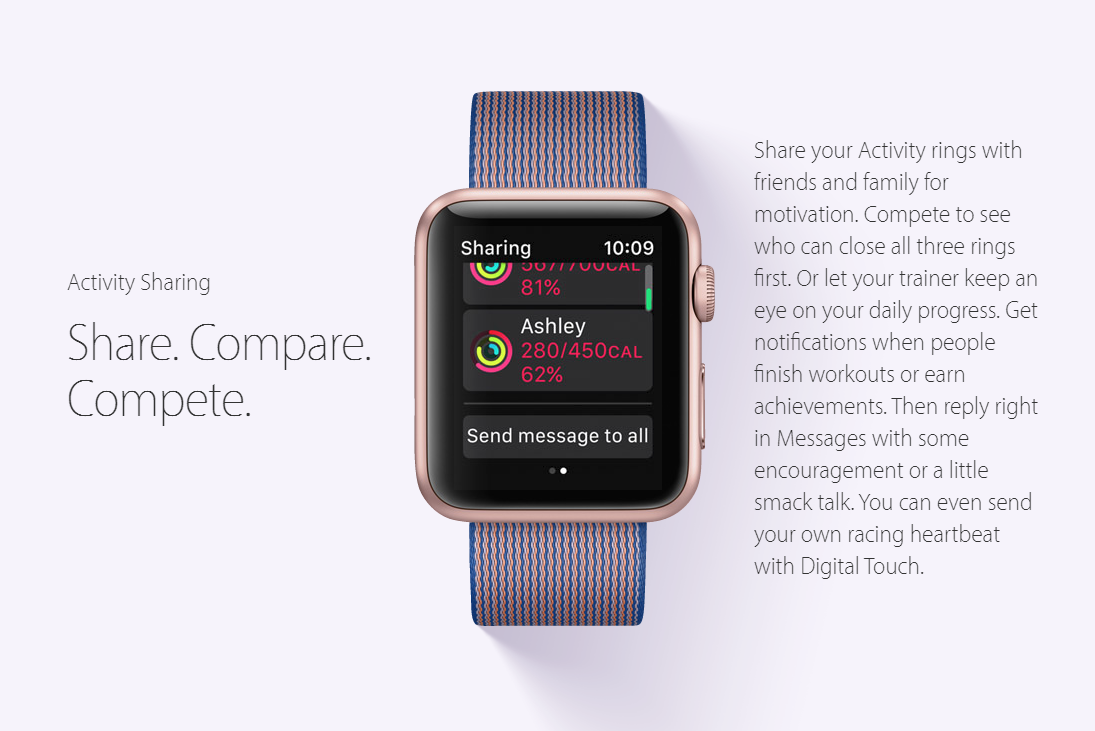 Deutlich mehr Wert legt Apple auf die Fitness-Funktionen der Apple Watch. mit watchOS 3 kann man die Aktivitätsringe nun mit seinen Sportfreunden teilen um sich besser zu motivieren. Die Ringe lassen sich nun auch auf den Watch Faces einblenden. Die Fitness-App wurde speziell für Menschen im Rollstuhl optimiert und soll nun zum Rollen statt zum Aufstehen animieren. Auch unterschiedliche Methoden der Rollstuhl-Bewegung wurden integriert. Dritthersteller können die Sensoren, beispielsweise die Herzfrequenz nun kontinuierlich nutzen und somit besser tracken.