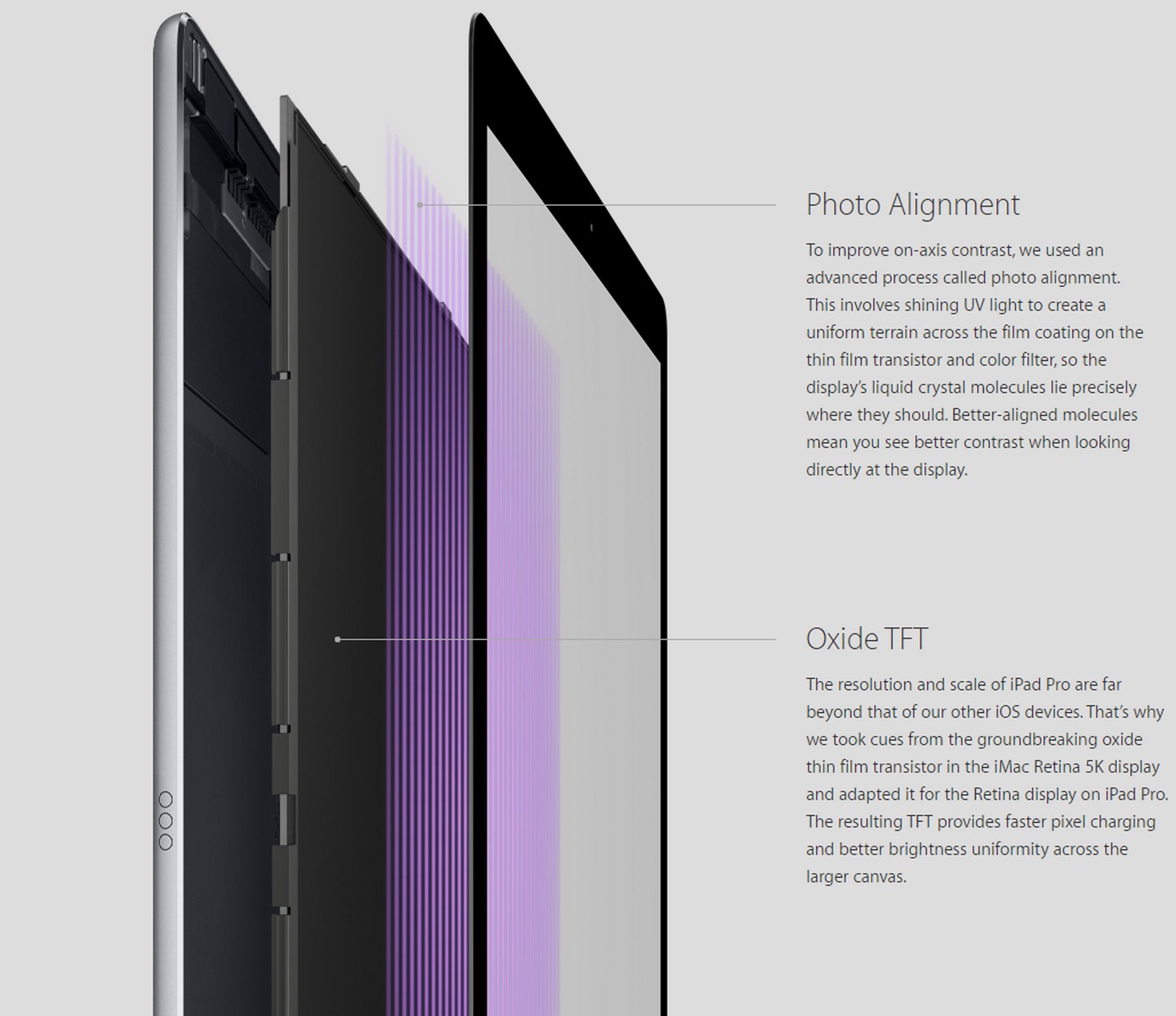 Der neue A9X-Chip soll die Leistung des Apple A9 aus den iPhone-6s-Modellen (wir berichteten) noch übertreffen. Ihm ist der M9 Motion Coprozessor zur Seite gestellt. Der A9X bietet die 1,8-fache Rechenleistung des A8X aus dem iPad Air 2. Die Grafikleistung soll doppelt so groß sein. Das 12,9 Zoll große Display hat eine Auflösung von 2.732 x 2.048 Pixeln bei 264 ppi. Die Pixeldichte entspricht somit jener des iPad Air 2. Eine Besonderheit des Tablets sind die vier Lautsprecher an den Ecken.
