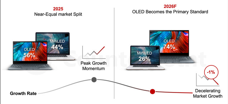 Während sich der Gesamtmarkt offenbar verlangsamt, steht dem Premium-Display-Segment laut Bericht schon bald ein größerer Wandel bevor. Die Auslieferungen von OLED-Notebook-Displays sollen im kommenden Jahr um 33 Prozent steigen – im Gegensatz zur Mini-LED-Technik, bei der ein Rückgang der Auslieferungen um 43 Prozent erwartet wird, da sich Marken zunehmend von dem alternden Hintergrundbeleuchtungssystem abwenden und stattdessen auf selbstleuchtende Panels setzen.