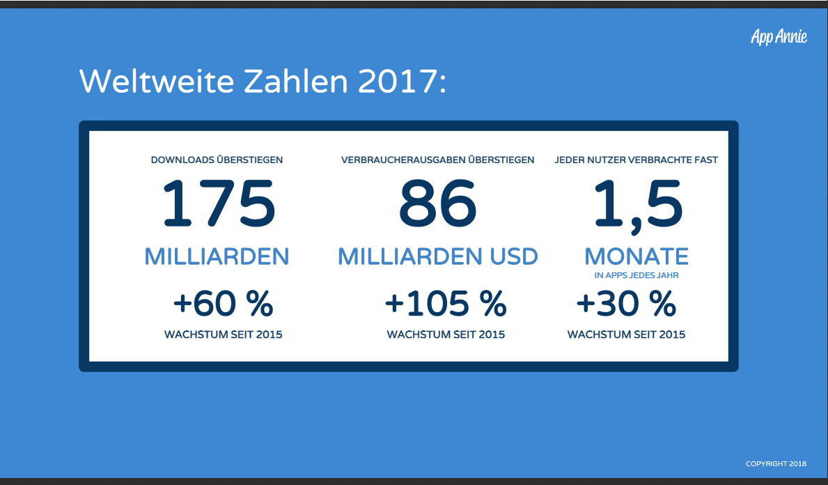 Jeder Nutzer verbringt im Jahr fast 1,5 Monate mit Apps. Das entspricht einem Wachstum von 30 Prozent im Vergleich zum Jahr 2015. Dies geht aus der Jahreszusammenfassung 2017 von App Annie hervor. Laut dem Marktbericht von App Annie gaben Konsumenten im Jahr 2017 global 86 Milliarden US-Dollar für Apps aus.