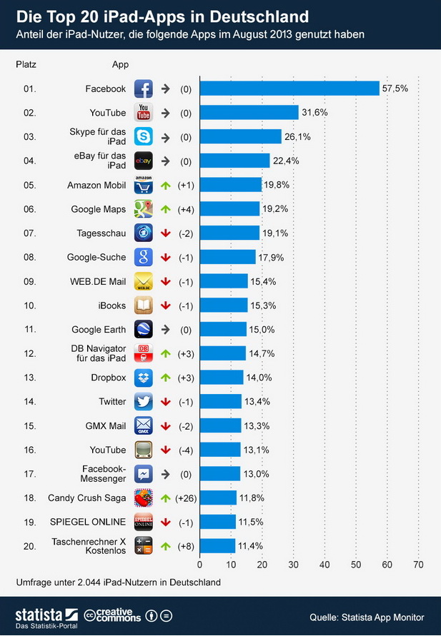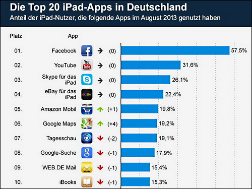 Im August 2013 behauptet sich Facebook mit 57,5 Prozent auf 1. Platz der beliebtesten iPad-Apps in Deutschland. Mit deutlichem Abstand folgen die Apps von YouTube (31,6 Prozent) und Skype für das iPad mit 26,1 Prozent auf den Positionen 2 und 3. Neu in den Top 20 ist das Spiel Candy Crush Saga (11,8 Prozent) und der Taschenrechner X Kostenlos (11,4 Prozent). Abgestiegen sind PayPal und Angry Birds HD.