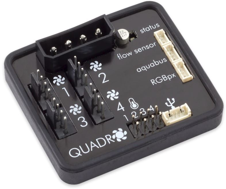 Der Aqua Computer Quadro-Controller ist mit vier 4-PIN-Anschlüssen für Lüfter ausgestattet, wobei jeder Anschluss bis zu 25 Watt bereitstellen kann - konkret lassen sich somit deutlich mehr als nur vier Lüfter via PWM regulieren. Dazu kommen insgesamt vier Eingänge für Temperatursensor,en Nutzer einer Wasserkühlung können auch einen Durchflusssensor anbinden.