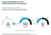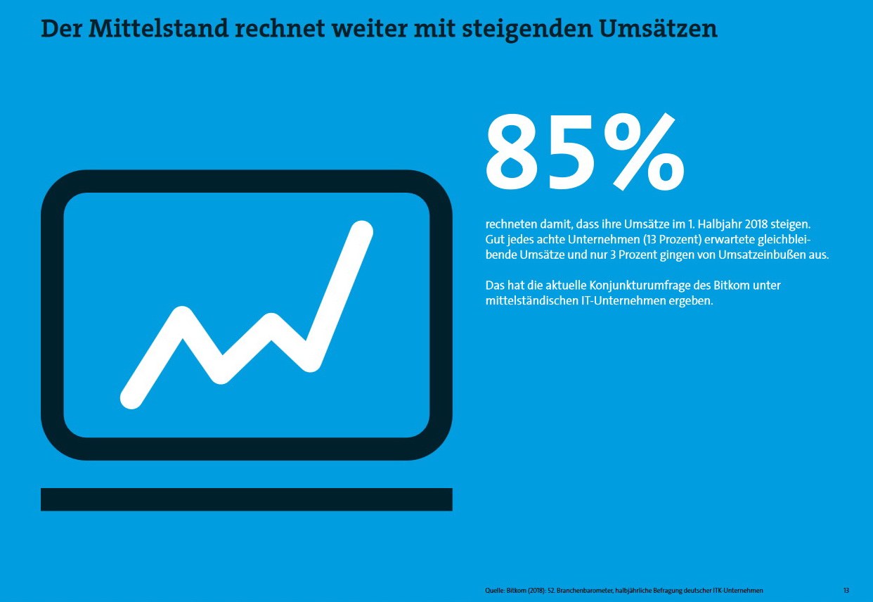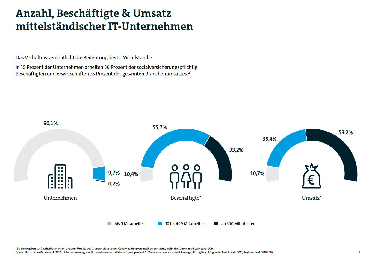 Der IT-Mittelstand wächst stabil und schafft neue Jobs. Das ist die Kernaussagen des Bitkom Mittelstandsberichts 2018. Demnach konnten die mittelständischen IT-Unternehmen in Deutschland ihre Umsätze innerhalb eines Jahres um 9 Prozent auf 68 Milliarden Euro steigern. Außerdem wurden im gleichen Zeitraum mehr als 30.000 zusätzliche Arbeitsplätze in der ITK geschaffen. Die Zahl der sozialversicherungspflichtigen Beschäftigten in IT-Unternehmen mit 10 bis 499 Mitarbeitern stieg um 31.422 auf 445.155. Laut dem Bitkom stehen 9.852 mittelständische Unternehmen für 35 Prozent des Umsatzes und 56 Prozent der sozialversicherungspflichtig Beschäftigten in der deutschen IT.