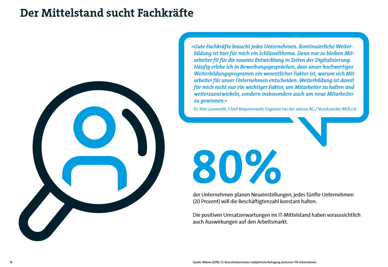 Große Herausforderungen sieht der Bitkom für die IT-Unternehmen in Deutschland durch den sich weiter zuspitzenden Fachkräftemangel. Alleine im IT-Mittelstand gebe es 14.500 offene Stellen für IT-Experten, so der Bitkom. Für Mittelständler sei es besonders schwierig, das Rennen um die klügsten und besten Köpfe zu gewinnen. Gesucht werden auch neue Chefs: Bis 2019 stehen in Deutschland insgesamt 240.000 Unternehmensnachfolgen an, viele davon in der IT.